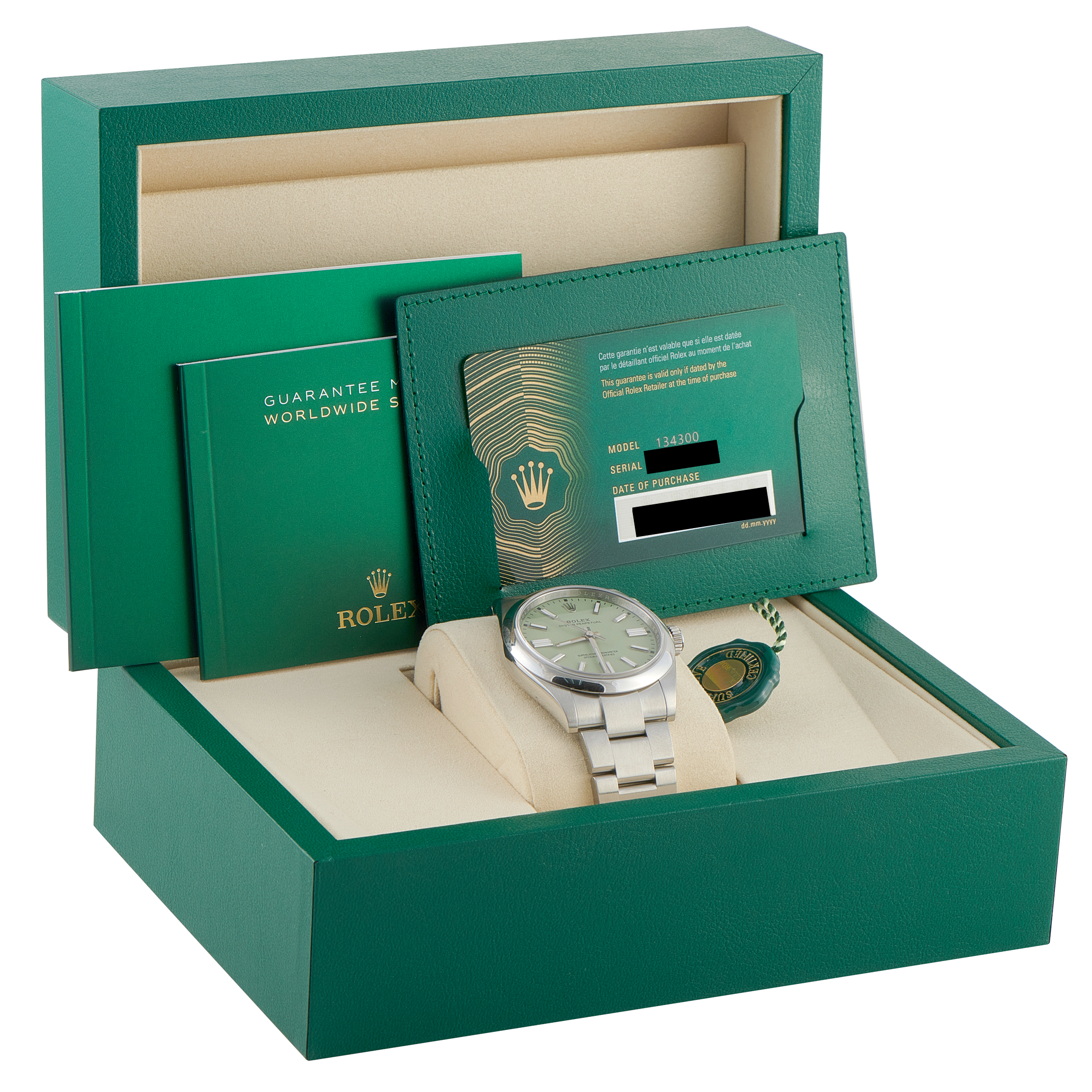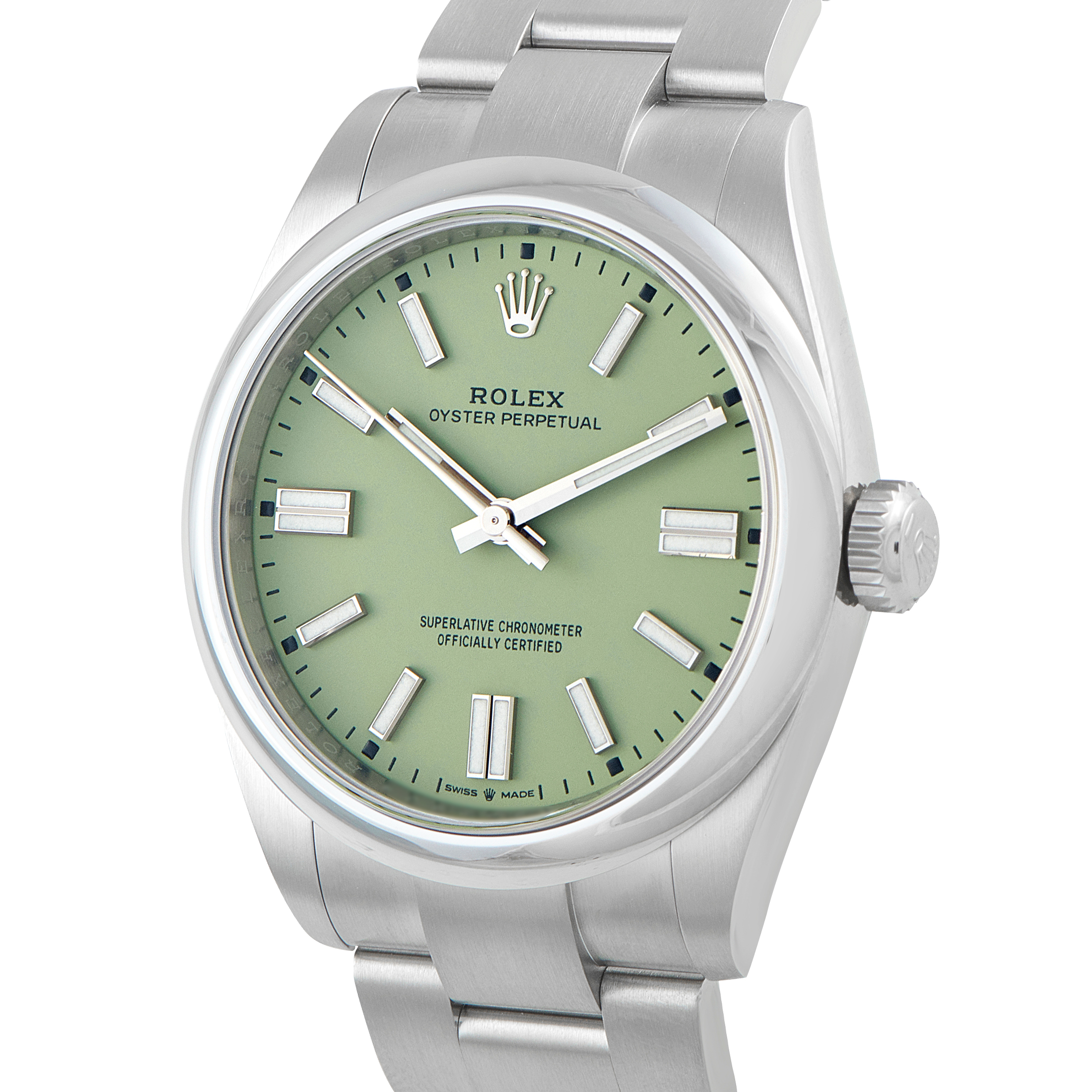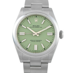 Offered unworn, this Rolex Oyster Perpetual Pistachio Dial Oystersteel Watch 134300 comes with papers and the manufacturer’s box.