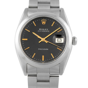 Offered pre-owned, this Rolex Oysterdate Precision Steel Watch 6694 comes with the manufacturer’s box.