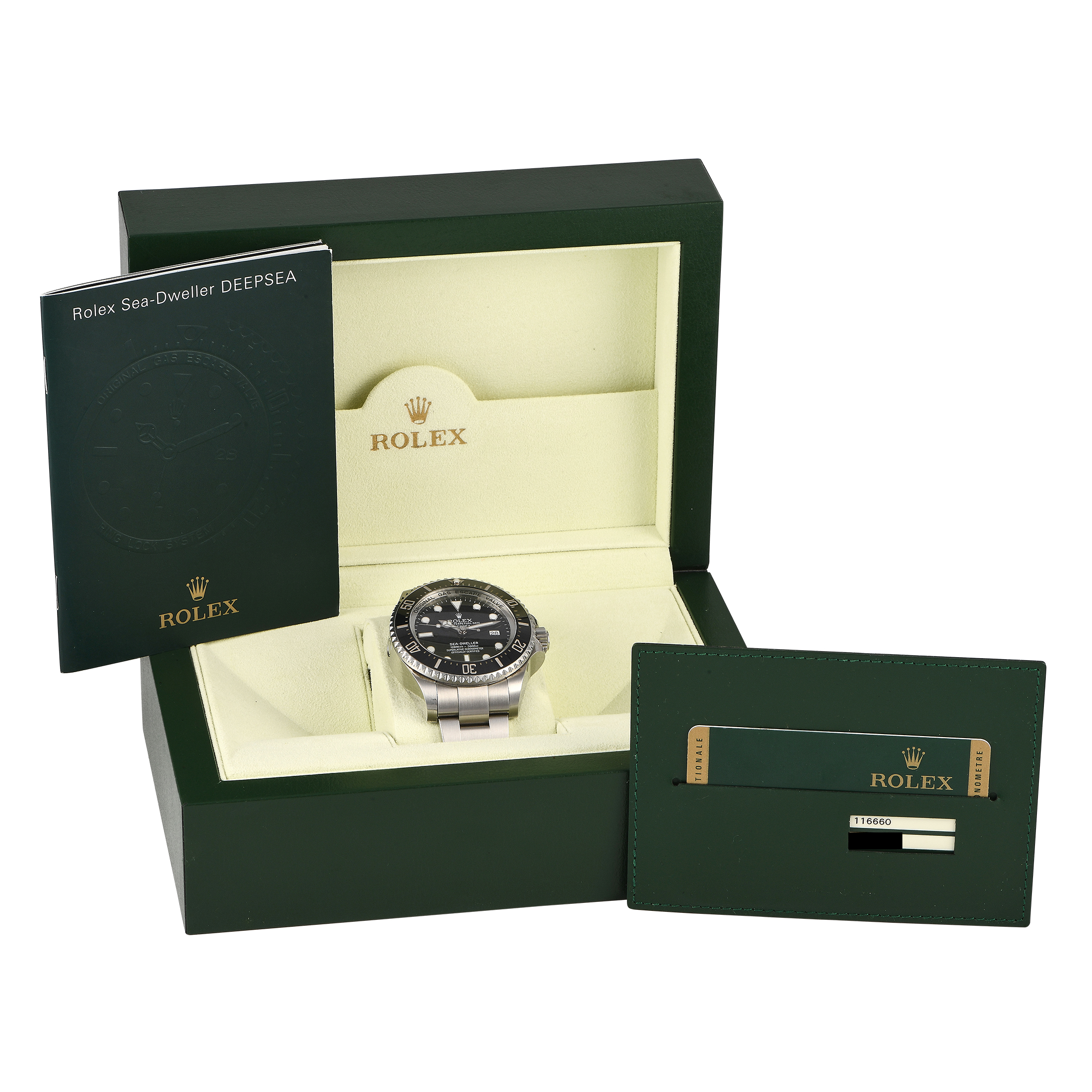 This Rolex Sea-Dweller Deepsea Watch 116660 is in pre-owned condition, accompanied by papers and the manufacturer’s box.