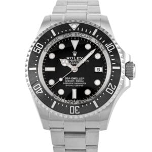 Papers and the manufacturer’s box accompany this pre-owned Rolex Sea-Dweller Deepsea Watch 136660-0004.