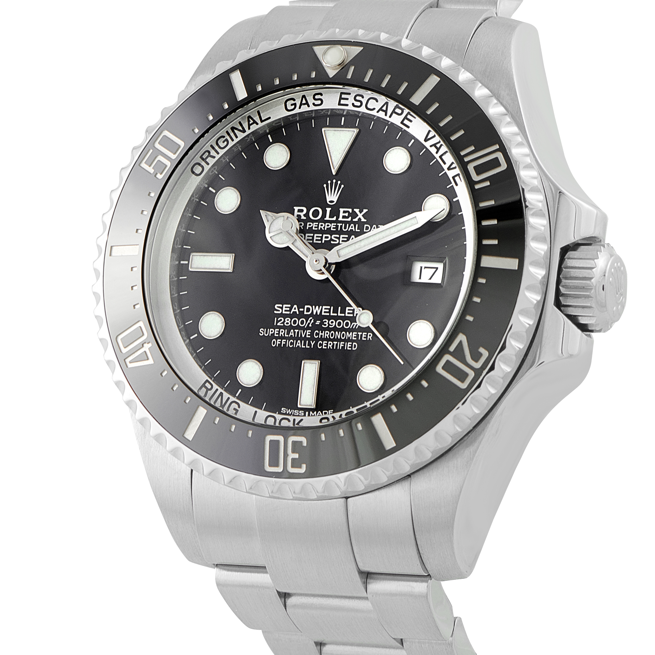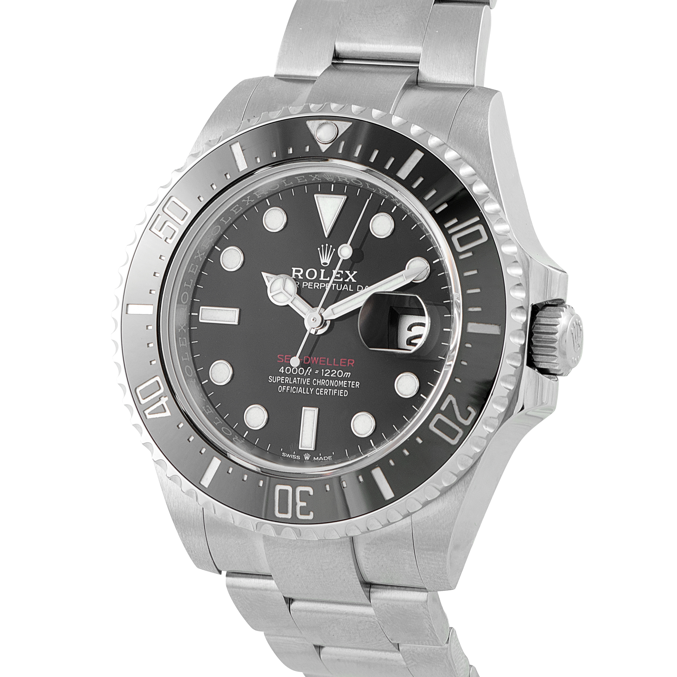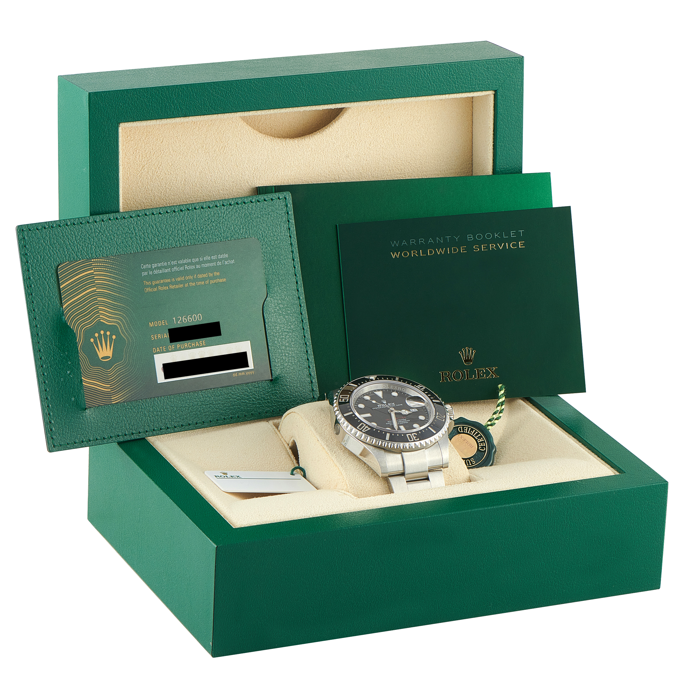 This is a pre-owned Rolex Sea-Dweller Black Dial Oystersteel Watch 126600. It comes with papers and the manufacturer’s box.