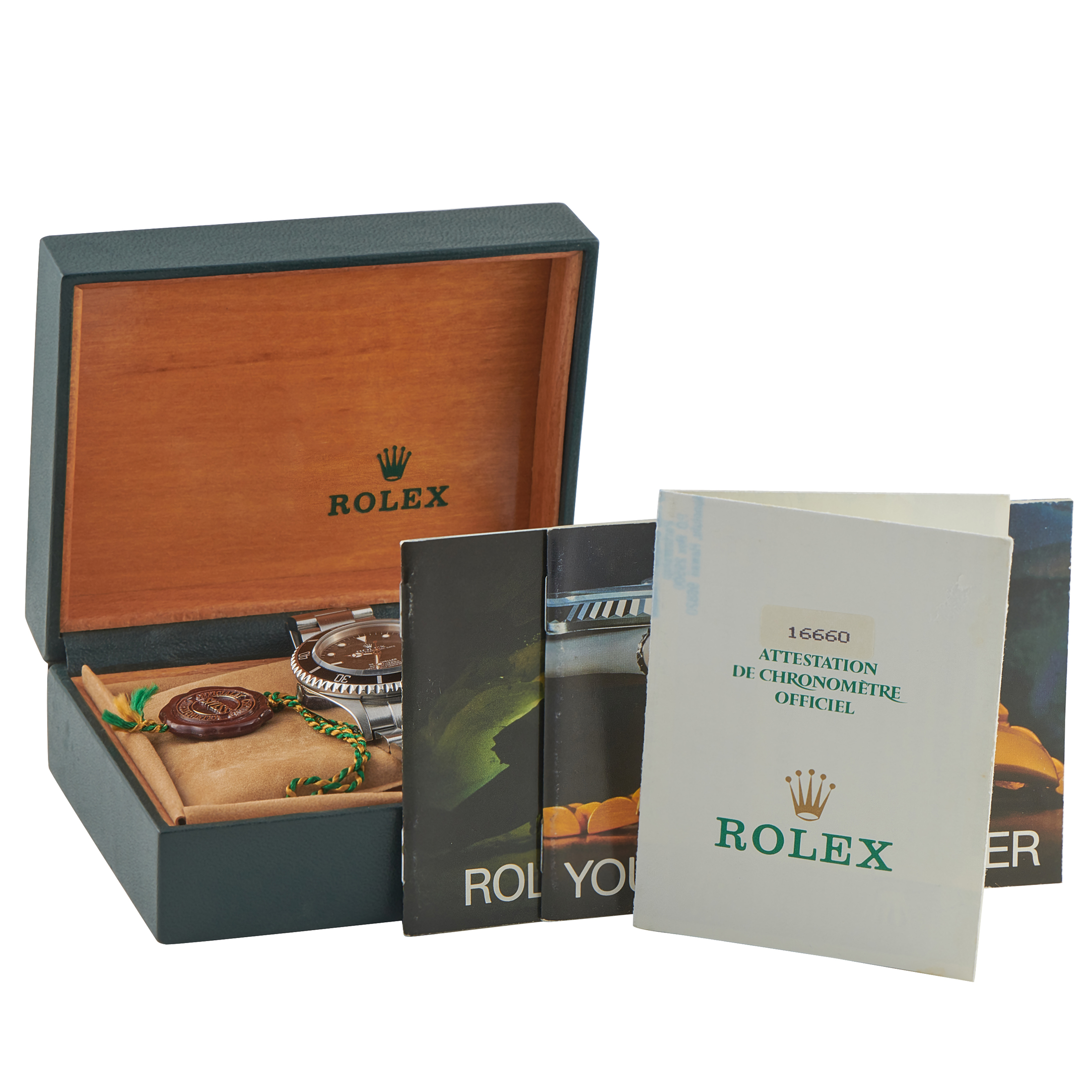 Offered pre-owned, this Rolex Sea-Dweller Triple Six Steel Watch 16660 comes with papers and the manufacturer’s box.