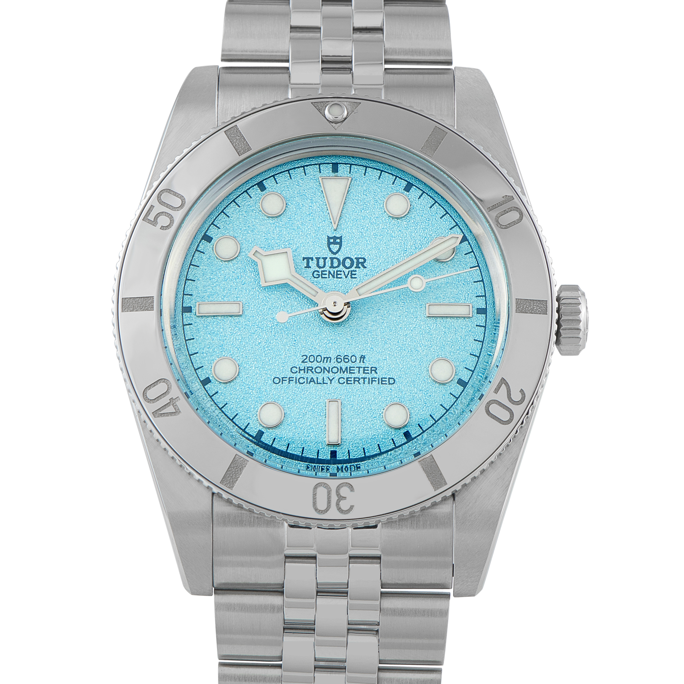 The Rolex Sea-Dweller reference 126600 was first released in 2017 in celebration of the model’s 50th anniversary. This incredible tool watch is water resistant to 4,000 ft and has a helium escape valve, just as a Sea-Dweller should. Its case size, however, is now larger by 3mm (compared to the 40mm case of ref.116600) but still built from a solid block of robust 904L stainless steel. The dial is glossy black, with white gold Chromalight-filled hour markers and hands, a magnified date window, and a red “Sea-Dweller” inscription. Legibility underwater is assured by the bright Chromalight that glows blue for up to eight hours. Powering this watch is the Rolex caliber 3235 automatic movement with approximately 70 hours of power reserve.
