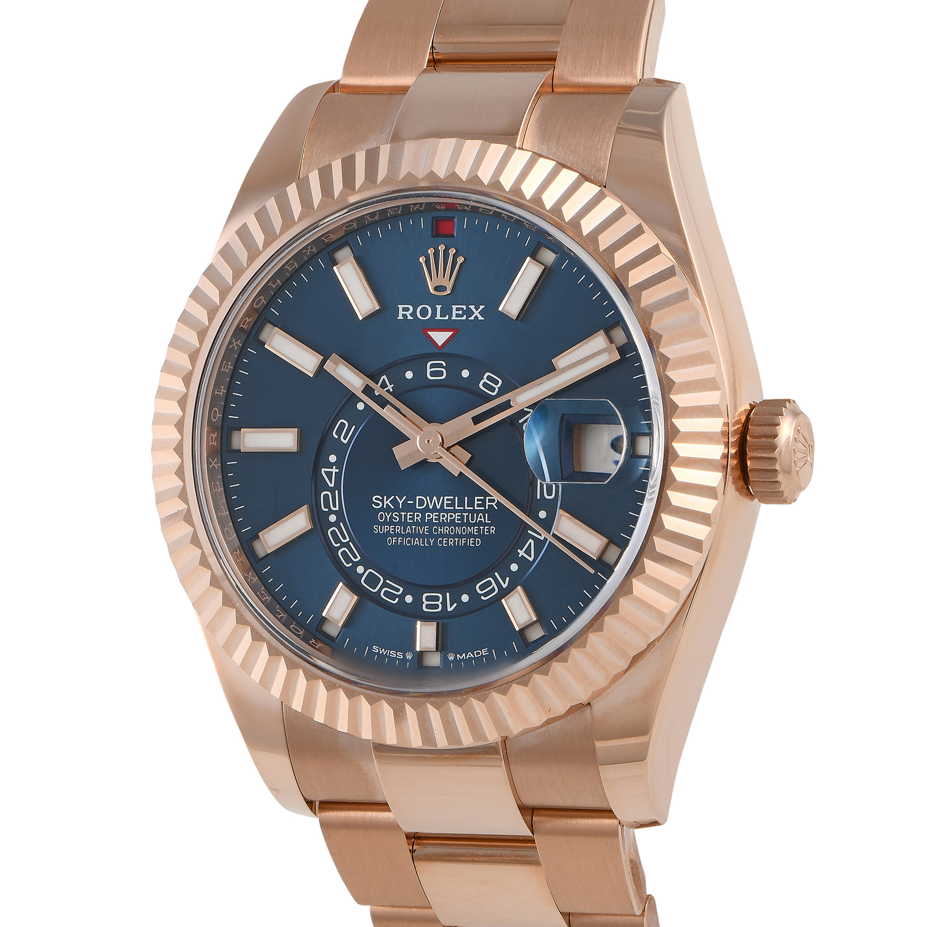 This unworn Rolex Sky-Dweller Blue Dial 18K Everose Gold Watch 336935 is accompanied by papers and the manufacturer’s box.