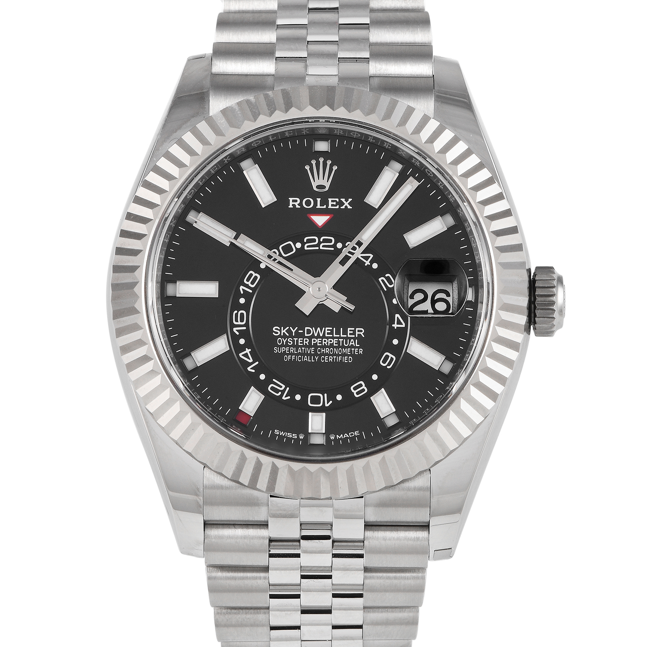 The black-dialed Sky-Dweller ref.336934 makes a handsome and reliable companion for frequent travelers. The watch is rendered in white gold Rolesor, featuring a 42mm Oystersteel case and an Oystersteel Jubilee bracelet complemented by Rolex’s signature fluted bezel in luxurious 18K white gold. This complex timepiece displays two distinct time zones and an annual calendar. The off-centered 24-hour ring works together with the inverted triangle pointer. On each hour marker is a month aperture that turns red to indicate the current month. Powering the watch is the Superlative Chronometer certifed caliber 9002 with a power reserve rated at 72 hours.