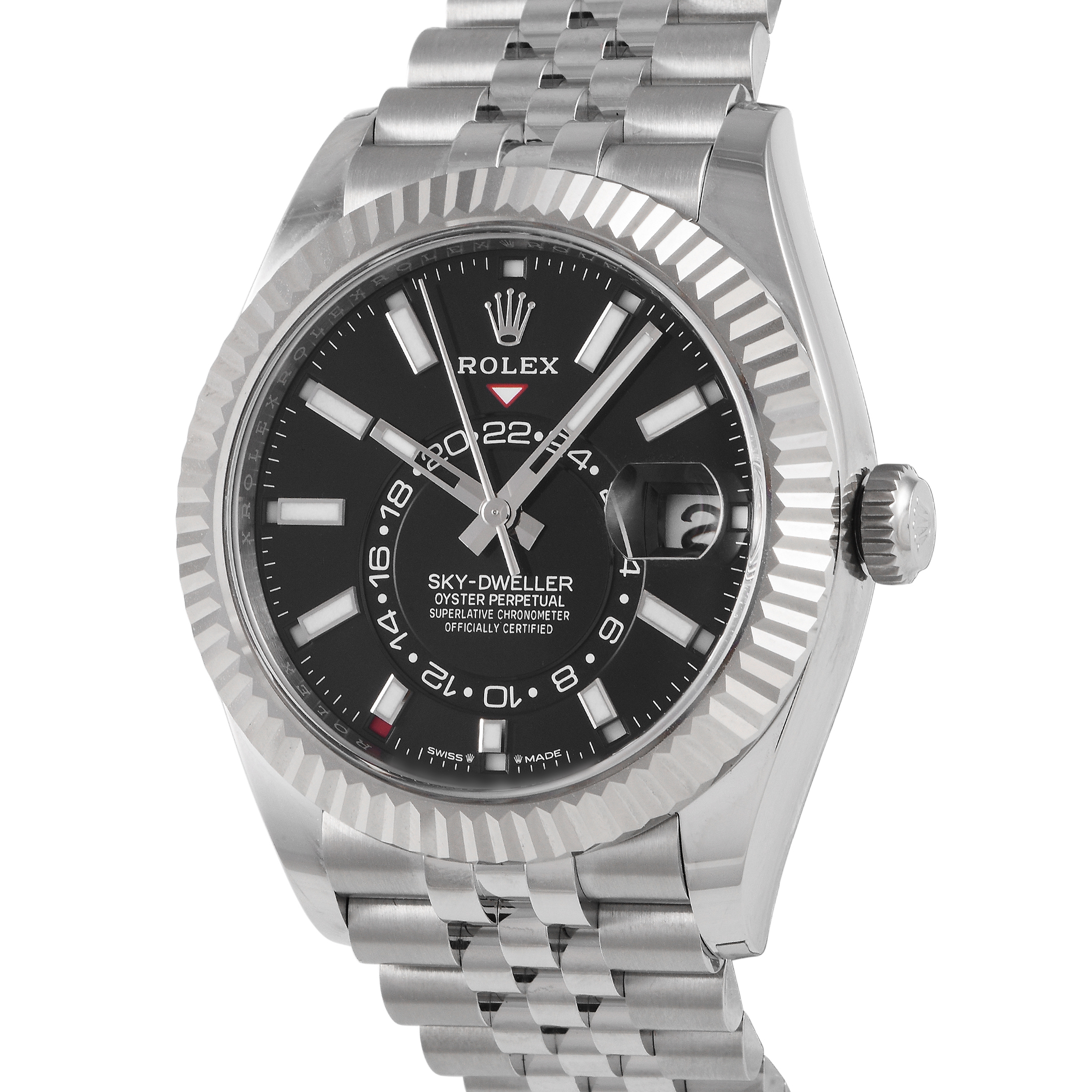 This unworn Rolex Sky-Dweller Black Dial Steel and White Gold Watch 336934 is accompanied by papers and the manufacturer’s box.