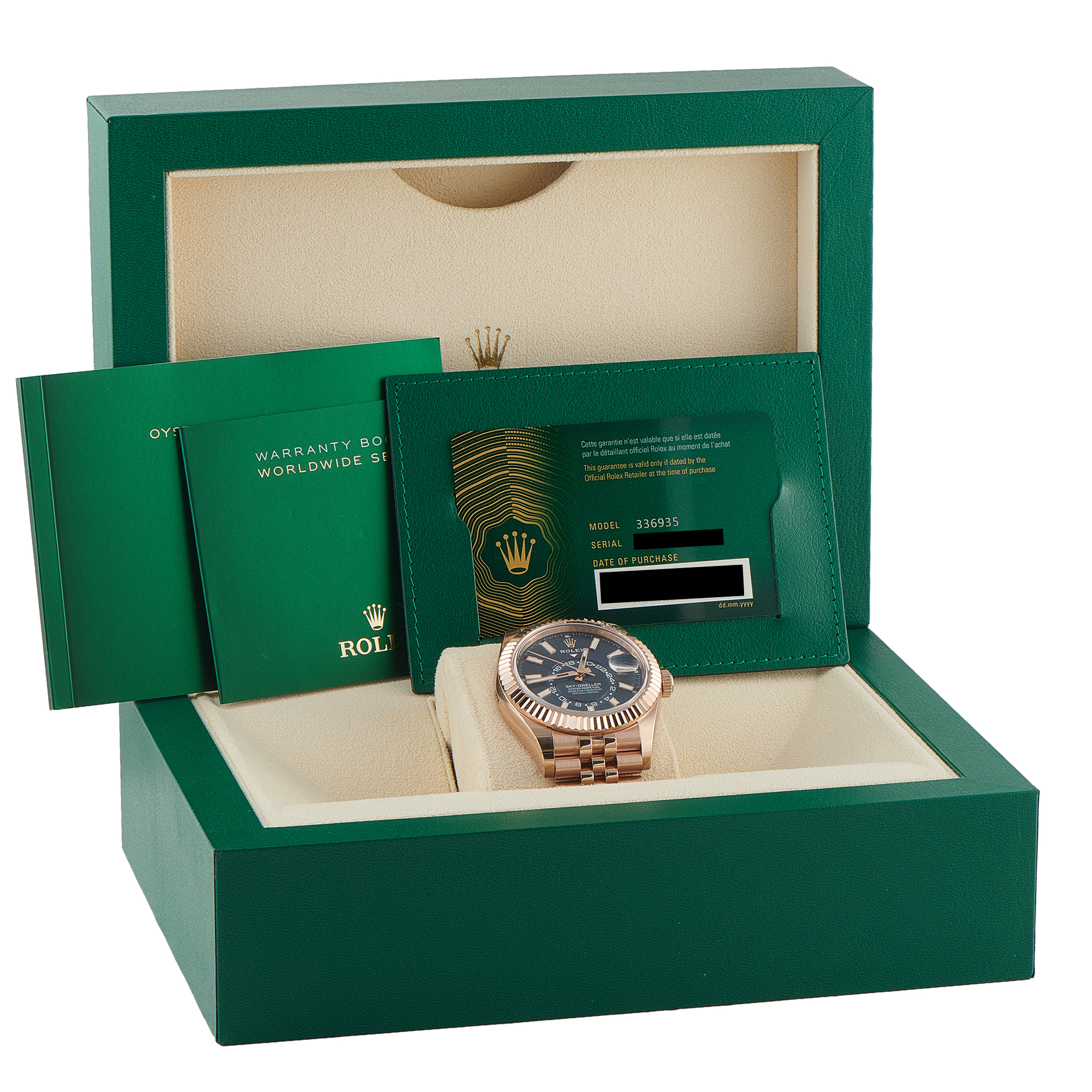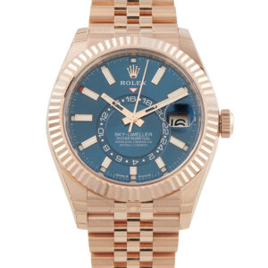 This pre-owned Rolex Sky-Dweller Blue Dial 18K Everose Gold Jubilee Watch 336935 comes complete with papers and the manufacturer’s box.