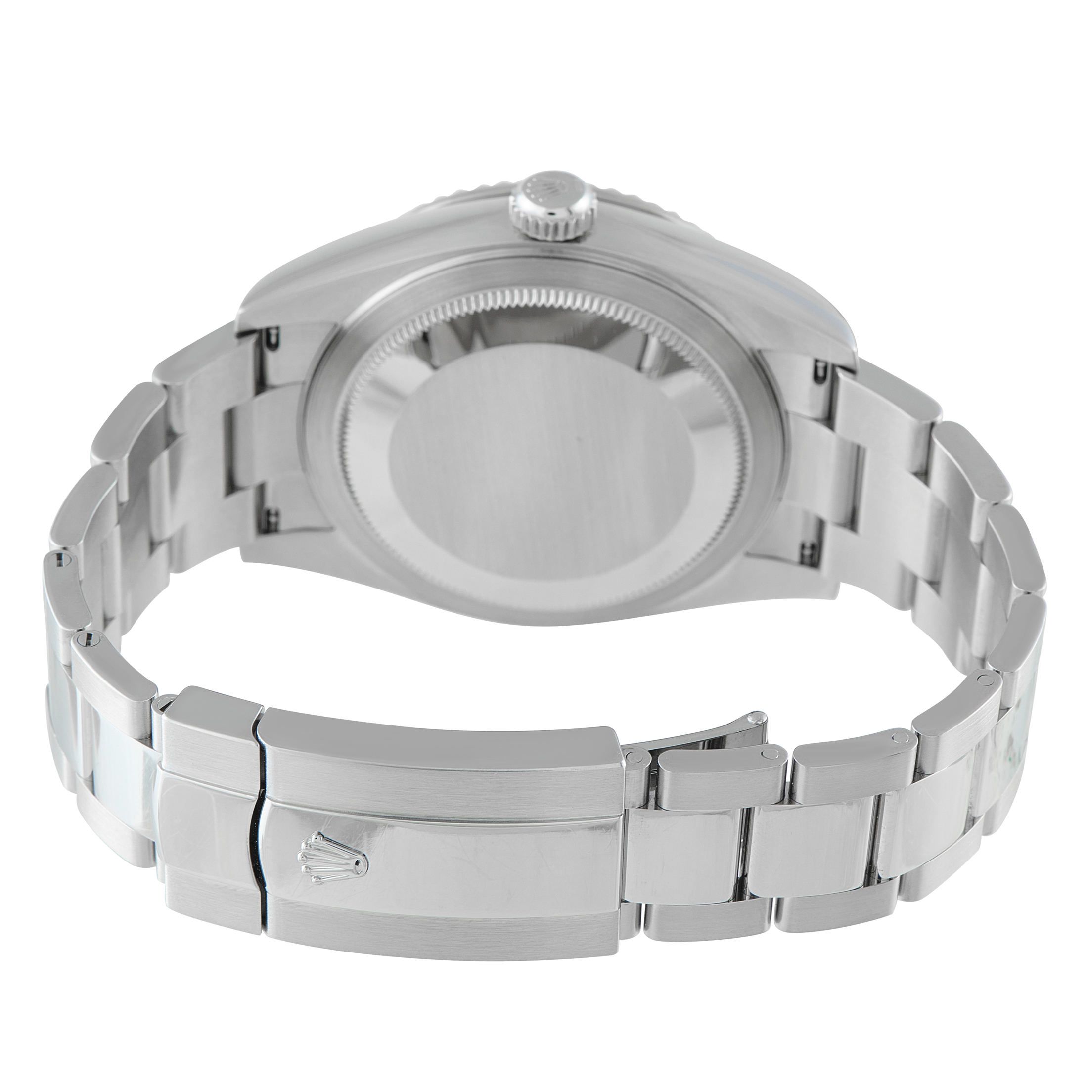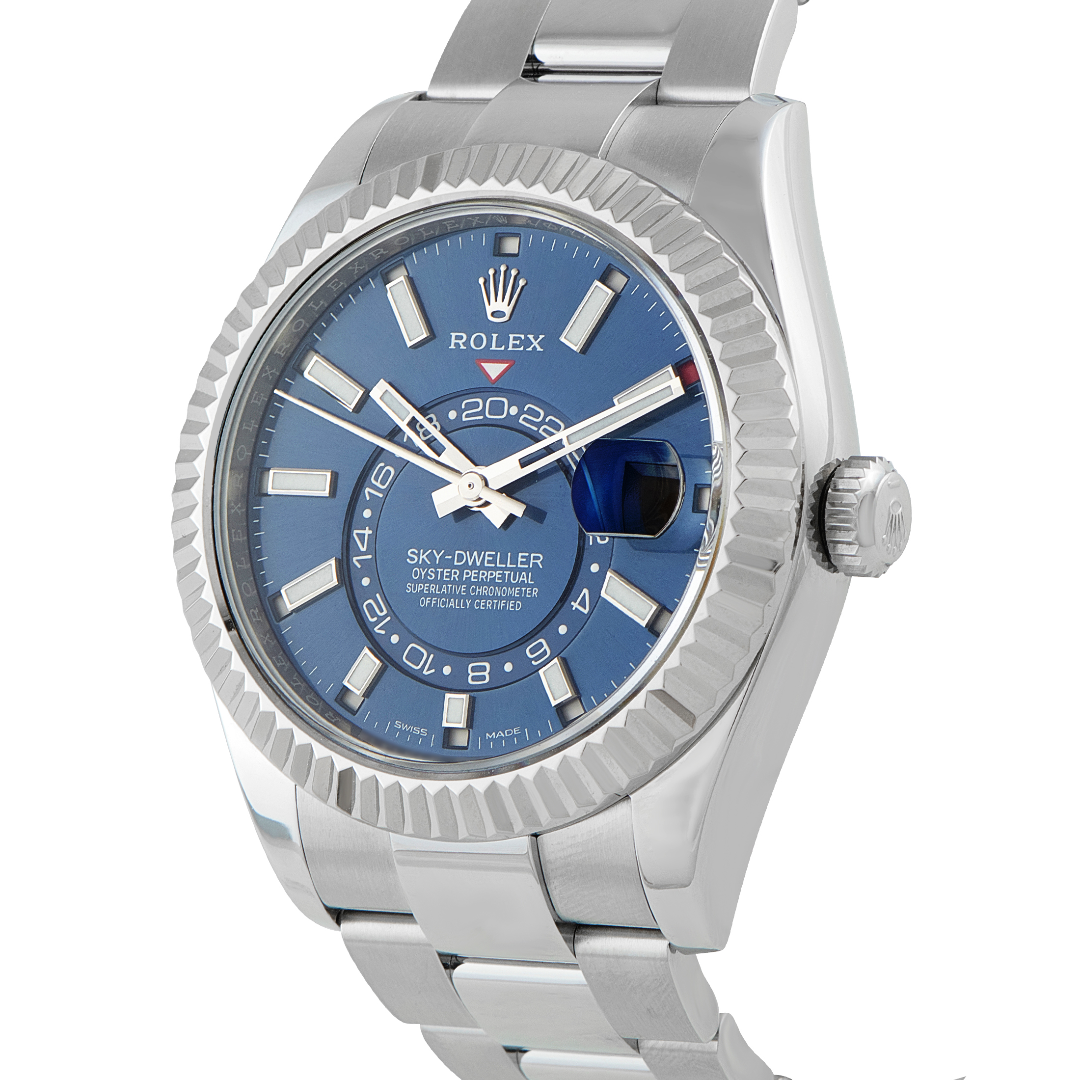 The watch built for global schedules. The Sky-Dweller ref. 326934 demonstrates technical capacity through its multi-functional interface. A 42mm Oystersteel case is framed by an 18k white gold fluted bezel, which operates the Ring Command System to adjust local time, home time, and the calendar. The sunray blue dial tracks dual time via an off-center 24-hour disc, while the annual calendar marks months through discreet apertures at each hour. Automatic Caliber 9001 delivers a 72-hour power reserve and instantaneous date change, regulated to Superlative Chronometer standards. The watch is fitted to an Oyster bracelet.