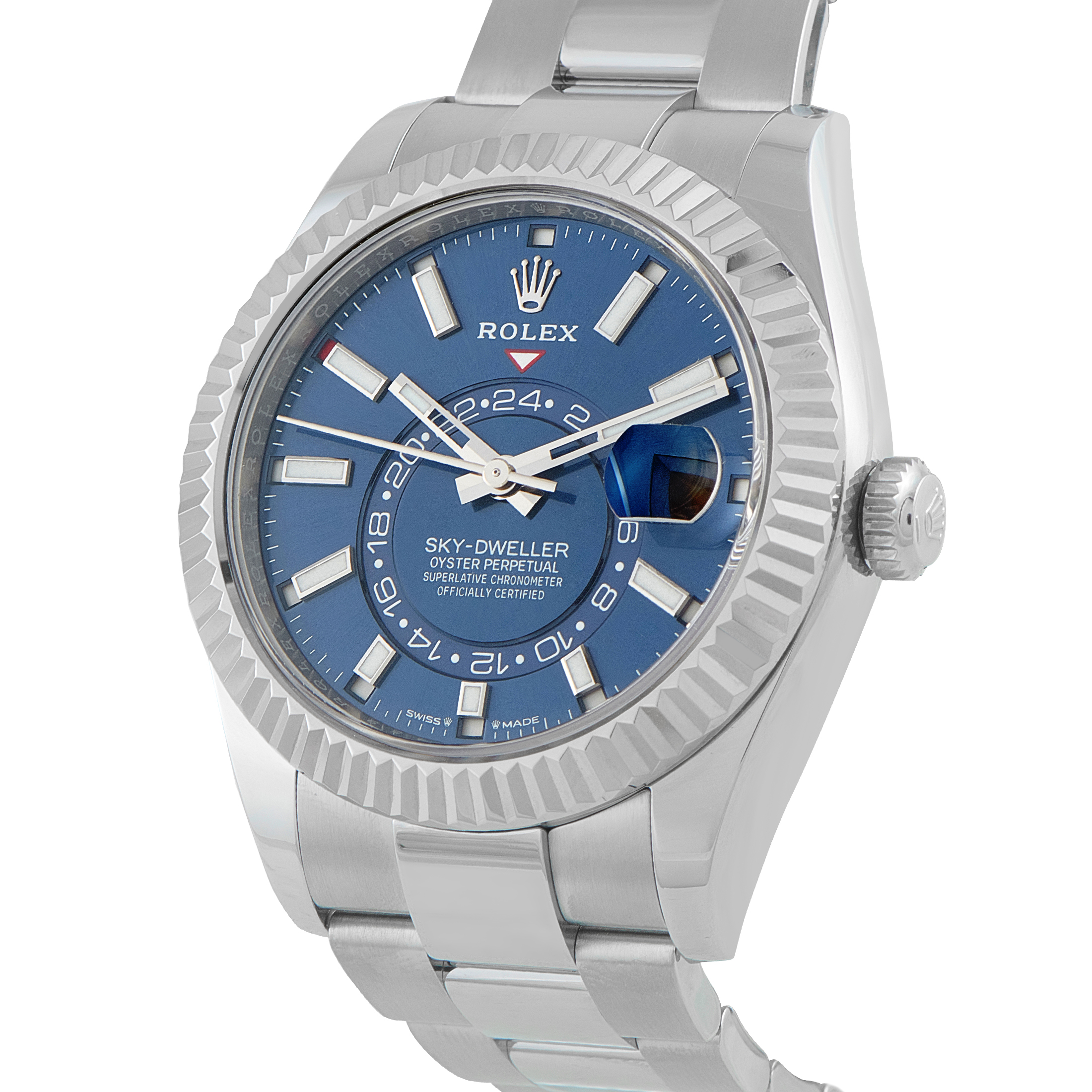 This unworn Rolex Sky-Dweller Blue Dial White Rolesor Watch 336934 comes with papers and the manufacturer’s box.