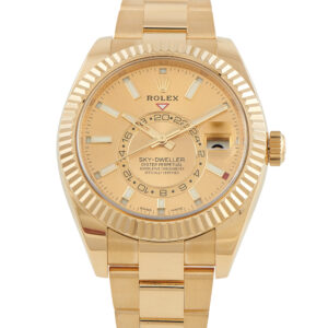 The Rolex Sky-Dweller 18K Yellow Gold Watch, reference number 326938, allows the wearer to effortlessly move through time zones.