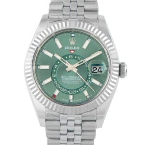 Papers and the manufacturer’s box accompany this pre-owned Rolex Sky-Dweller Mint Green Dial Jubilee White Rolesor Watch 336934.
