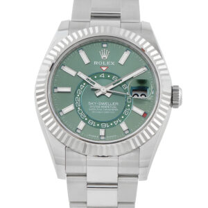 Papers and the manufacturer’s box accompany this Rolex Sky-Dweller Mint Green Dial White Rolesor Watch 336934.