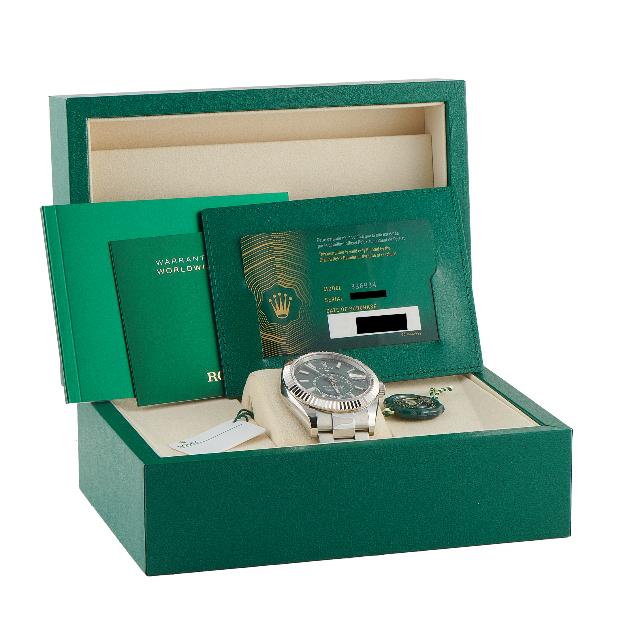 Mint, handled the Rolex way. This Sky-Dweller ref. 336934 carries a mint green dial applied with exact control, ensuring it remains crisp rather than casual. The even tone provides the 18K white gold markers and Saros calendar apertures with high-definition visibility.
