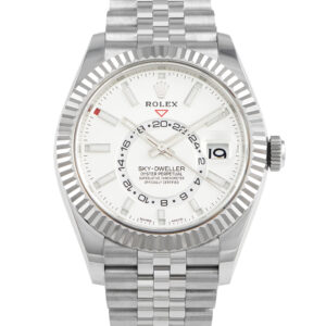 Papers and the manufacturer’s box accompany this unworn Rolex Sky-Dweller White Dial White Rolesor Jubilee Watch 326934.