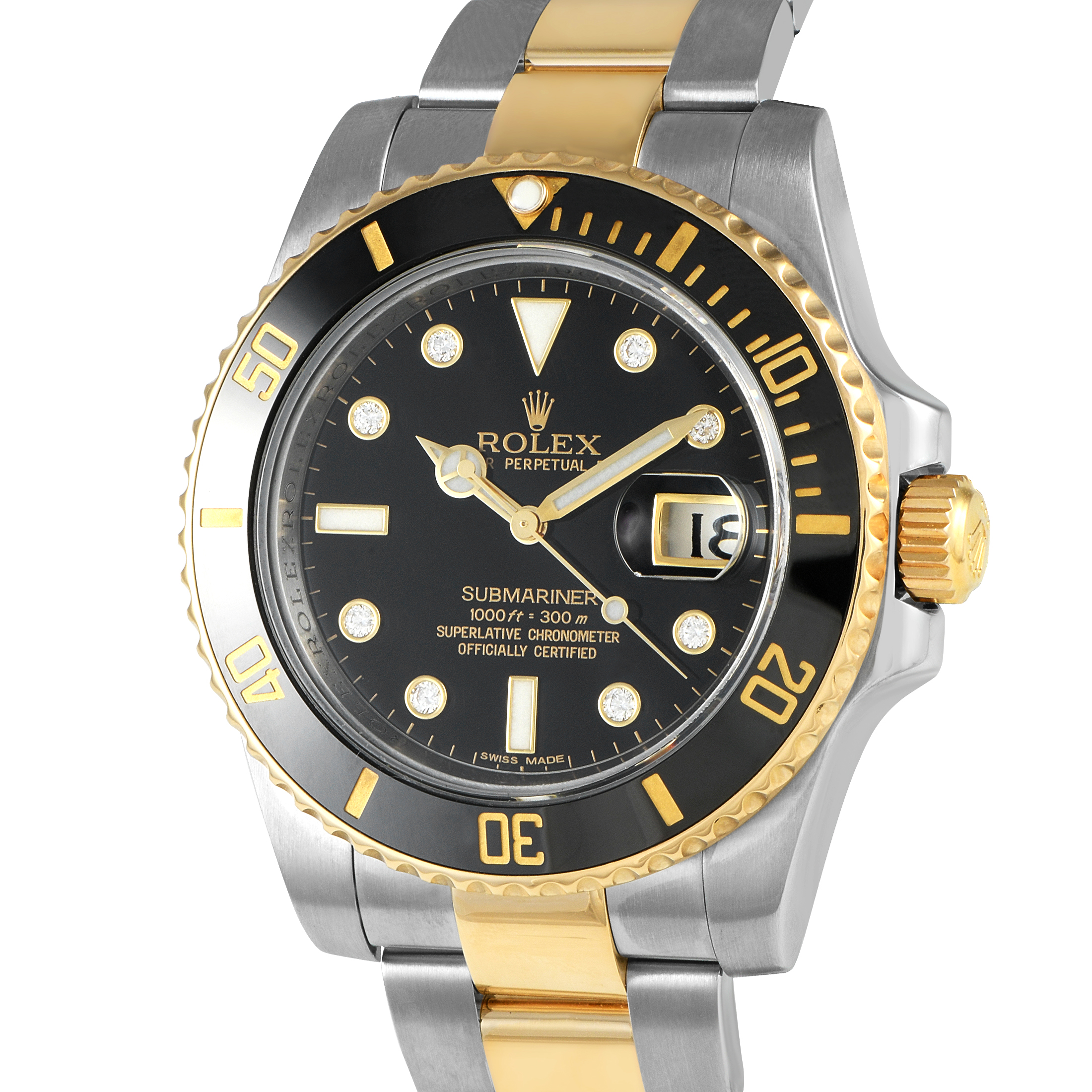 There is something truly captivating about the smooth lines and strikingly defined features of a Rolex Submariner Date that appeals to discerning collectors. This particular stunner, Rolex Submariner Date ref. 116613LN, exudes a go-anywhere nature while maintaining its sophistication. It features a 40mm steel case paired with an 18K yellow gold bezel with a black ceramic insert engraved with a tachymeter scale. Complementing the bezel is a black dial with yellow gold hands filled with bright luminescent material, a date window in a yellow gold frame, luminous 6-9-12 shape markers with yellow gold rims, and eight diamond hour markers mounted on yellow gold frames.