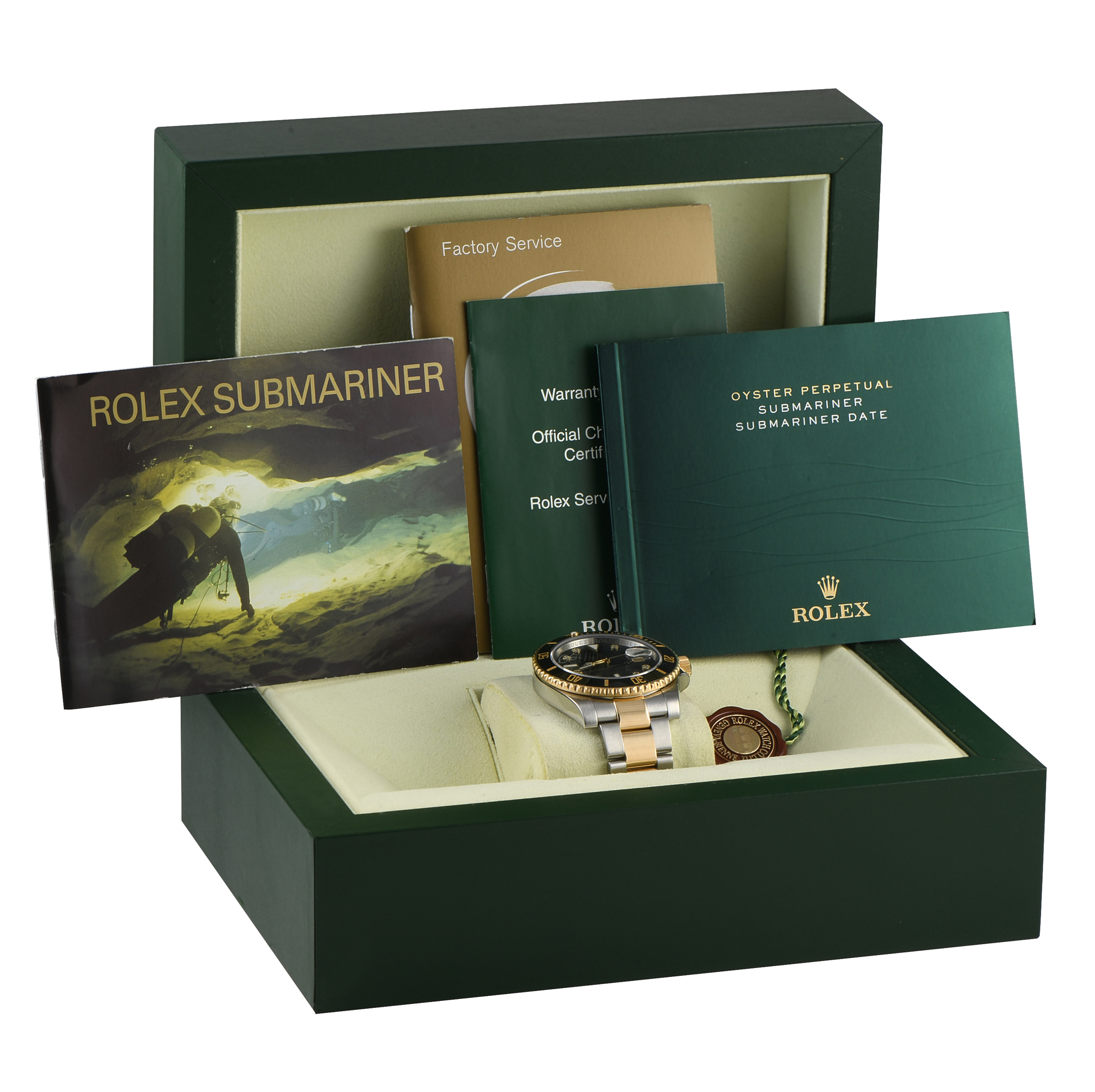 This pre-owned Rolex Submariner Date Yellow Rolesor Watch 116613LN comes complete with papers and the manufacturer’s box.