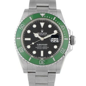 Papers and the manufacturer’s box accompany this unworn Rolex Submariner Date Starbucks Steel Watch 126610LV.