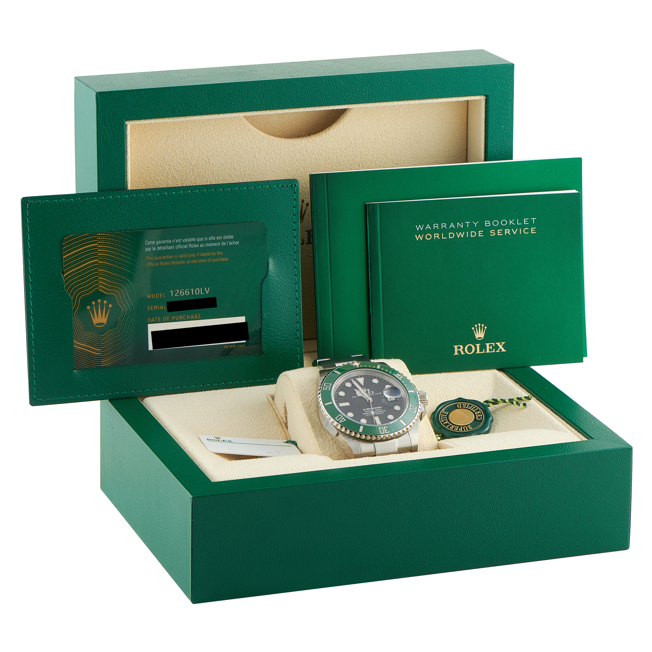 Offered pre-owned, this Rolex Submariner Date Starbucks Steel Watch 126610LV comes complete with papers and the manufacturer’s box.