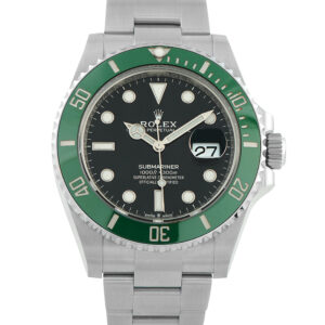 Papers and the manufacturer’s box accompany this pre-owned Rolex Submariner Date Starbucks Oystersteel Watch 126610LV.