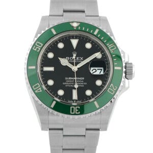 The “Starbucks” Rolex Submariner, ref. 126610LV, replaced the popular Hulk Submariner in 2020. Sometimes called the “Cermit” (or just “Kermit”), it features a green ceramic bezel insert surrounding a black dial with Chromalight-filled hour plots. Caliber 3235 gives the watch 70 hours of power reserve and a guaranteed accuracy of +/-2 seconds per day.