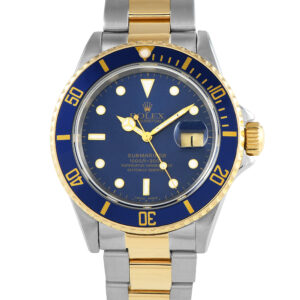 This is a pre-owned Rolex Submariner Blue Dial Two-Tone Watch 16613LB. It comes with the manufacturer’s box.