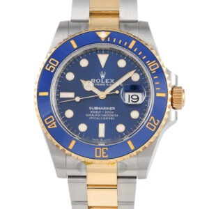 This pre-owned Rolex Submariner Blue Dial Two-Tone Watch 126613LB includes papers and a gift box.