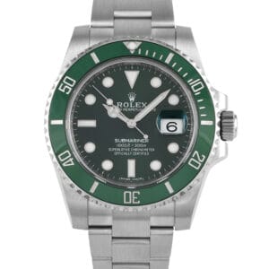 This is a pre-owned Rolex Submariner Date Hulk Watch 116610LV. It comes with papers and the manufacturer’s box.