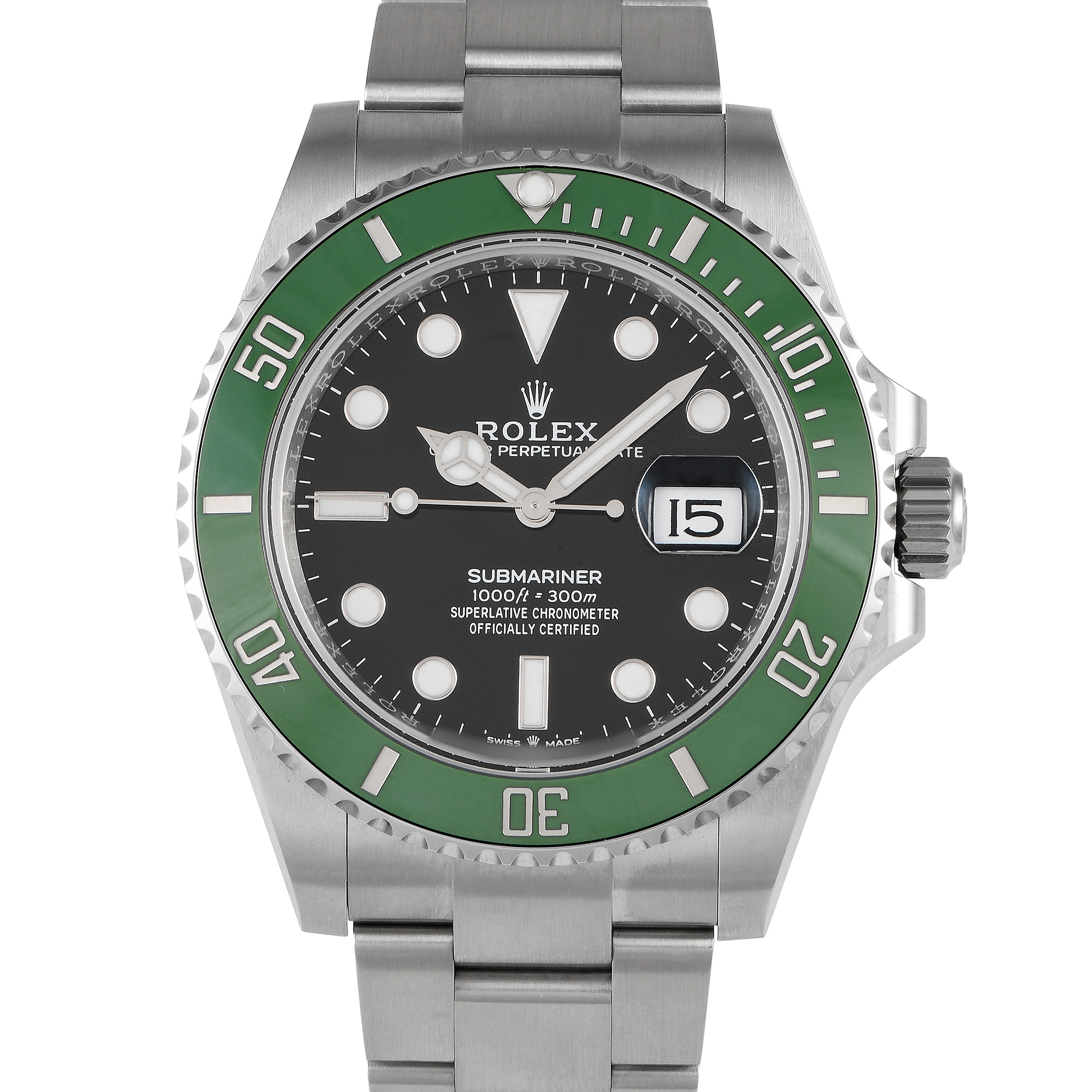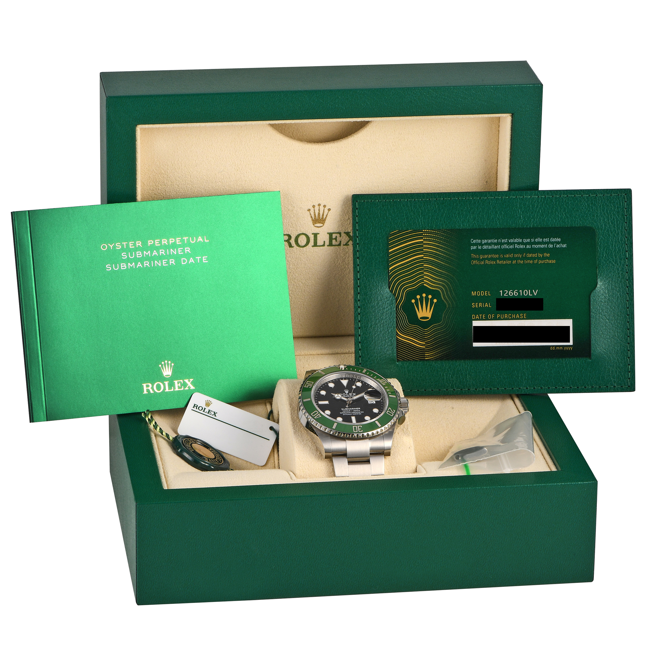 This unworn Rolex Submariner Date “Starbucks” 41mm Watch 126610LV comes with papers and the manufacturer’s box.