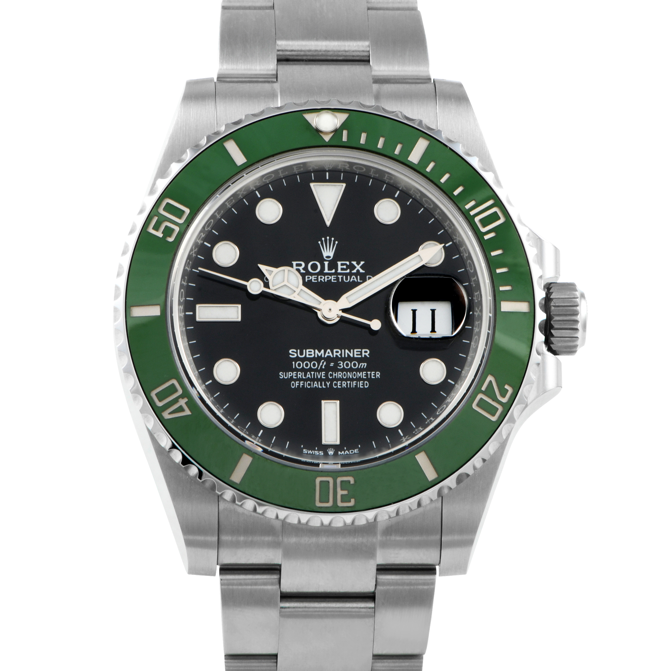 The “Starbucks” Rolex Submariner, ref. 126610LV, replaced the popular Hulk Submariner in 2020. Sometimes called the “Cermit” (or just “Kermit”), it features a green ceramic bezel insert surrounding a black dial with Chromalight-filled hour plots. Caliber 3235 gives the watch 70 hours of power reserve and a guaranteed accuracy of +/-2 seconds per day.