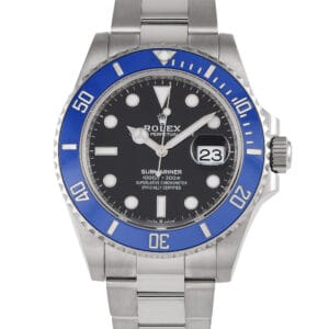 Papers and the manufacturer’s box accompany this pre-owned Rolex Submariner Date Blue Bezel 18K White Gold Watch 126619LB.