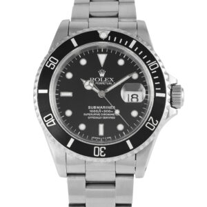 This is a pre-owned Rolex Submariner Date Black Dial Watch 16610. It is accompanied by a gift box.