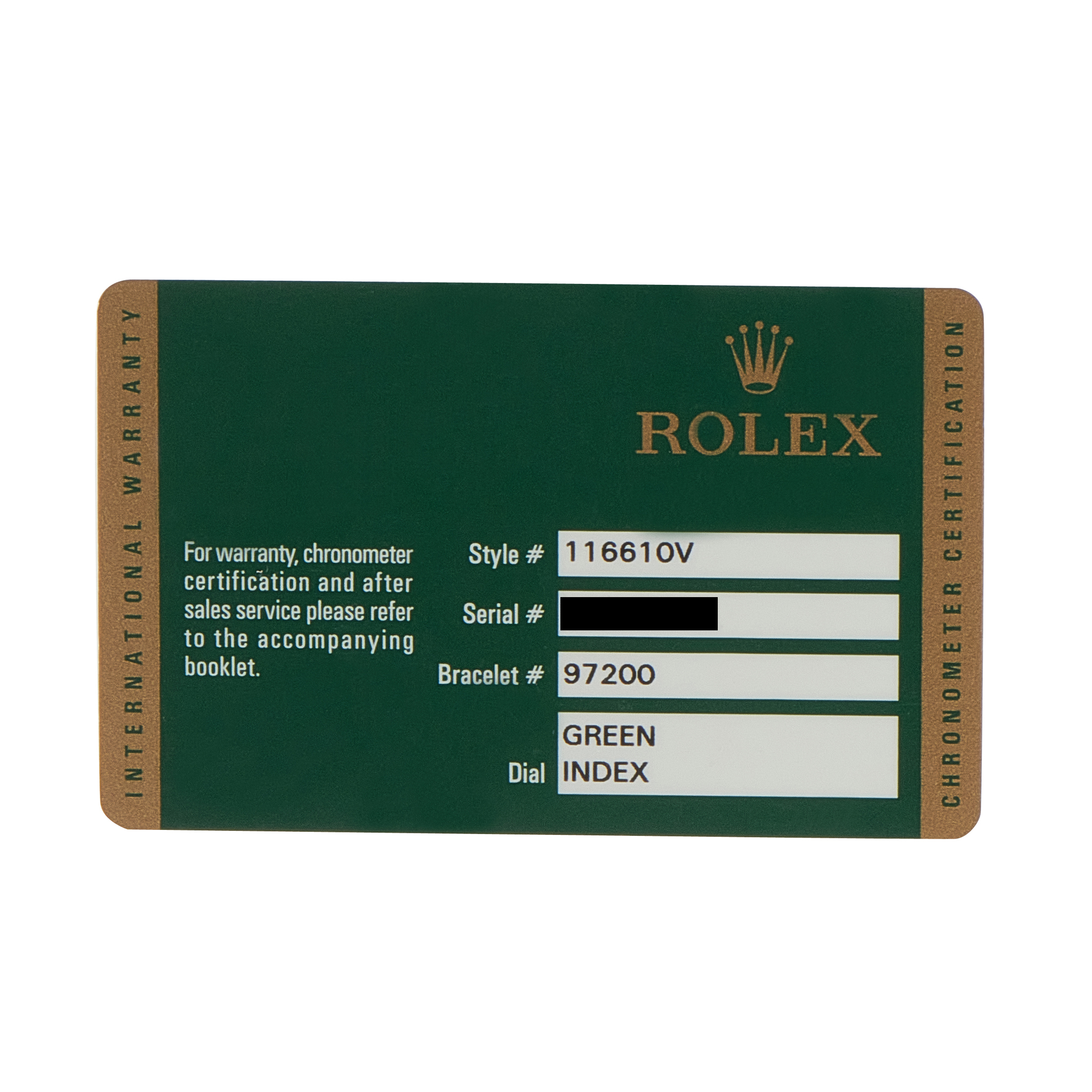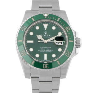 This is a pre-owned Rolex Submariner Hulk Oystersteel Watch 116610V. It is accompanied by the manufacturer’s box and papers.