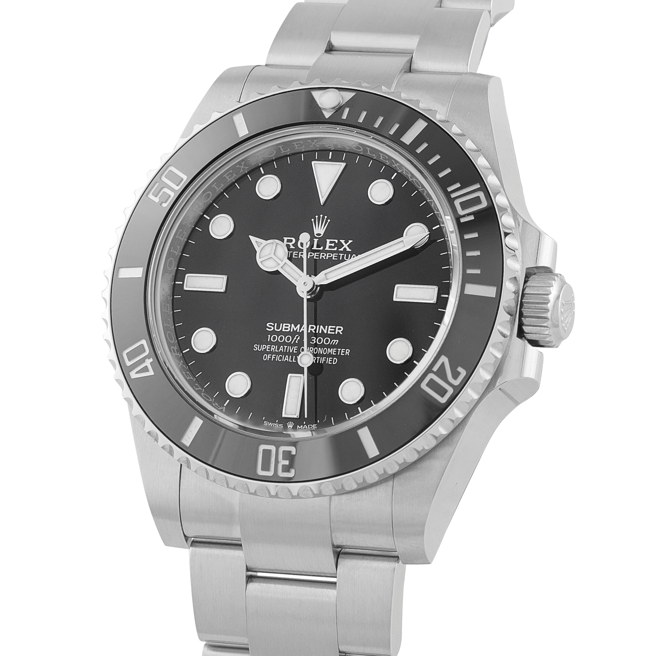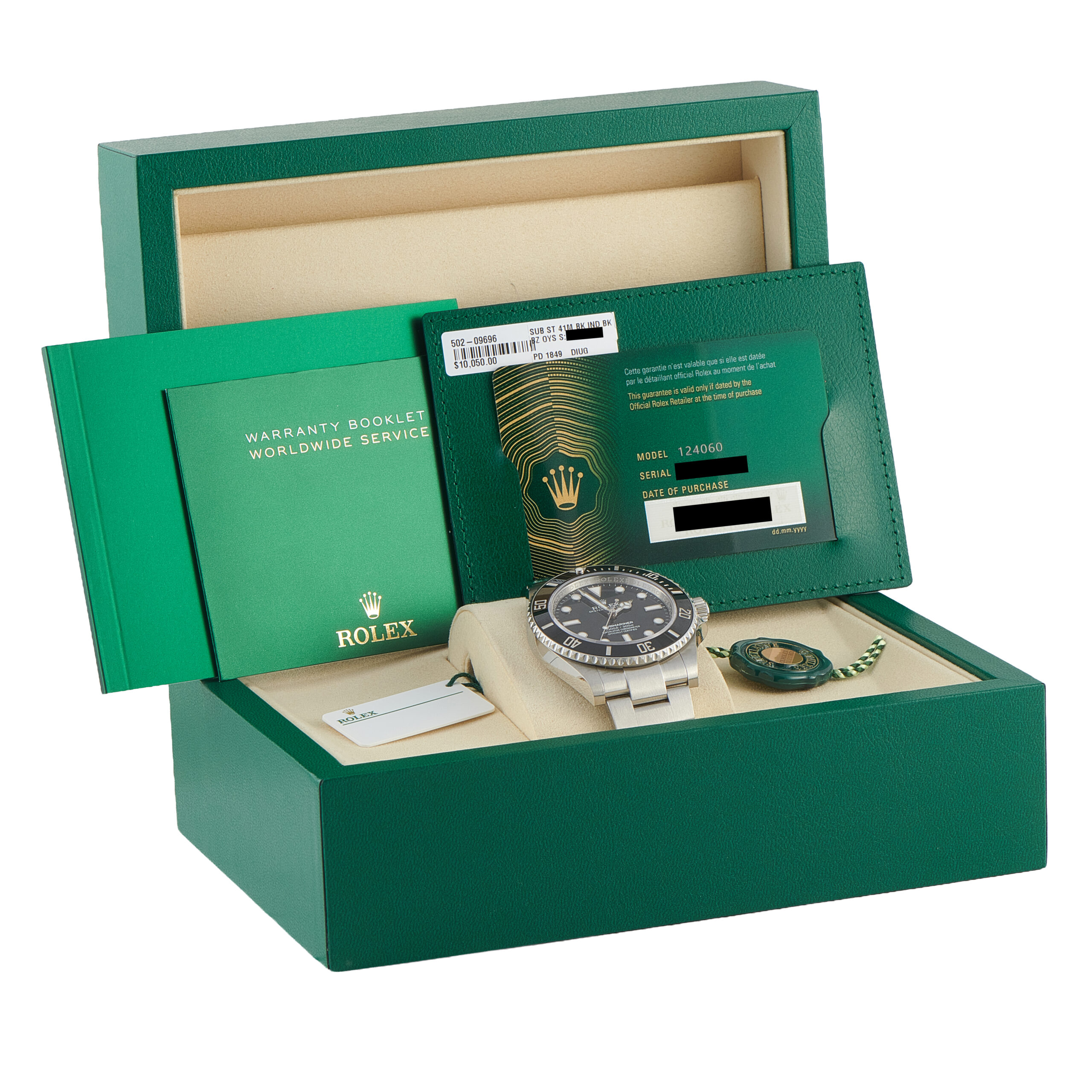 This is an unworn Rolex Submariner No-Date Black Dial 124060. It is accompanied by official documentation and the manufacturer’s box.