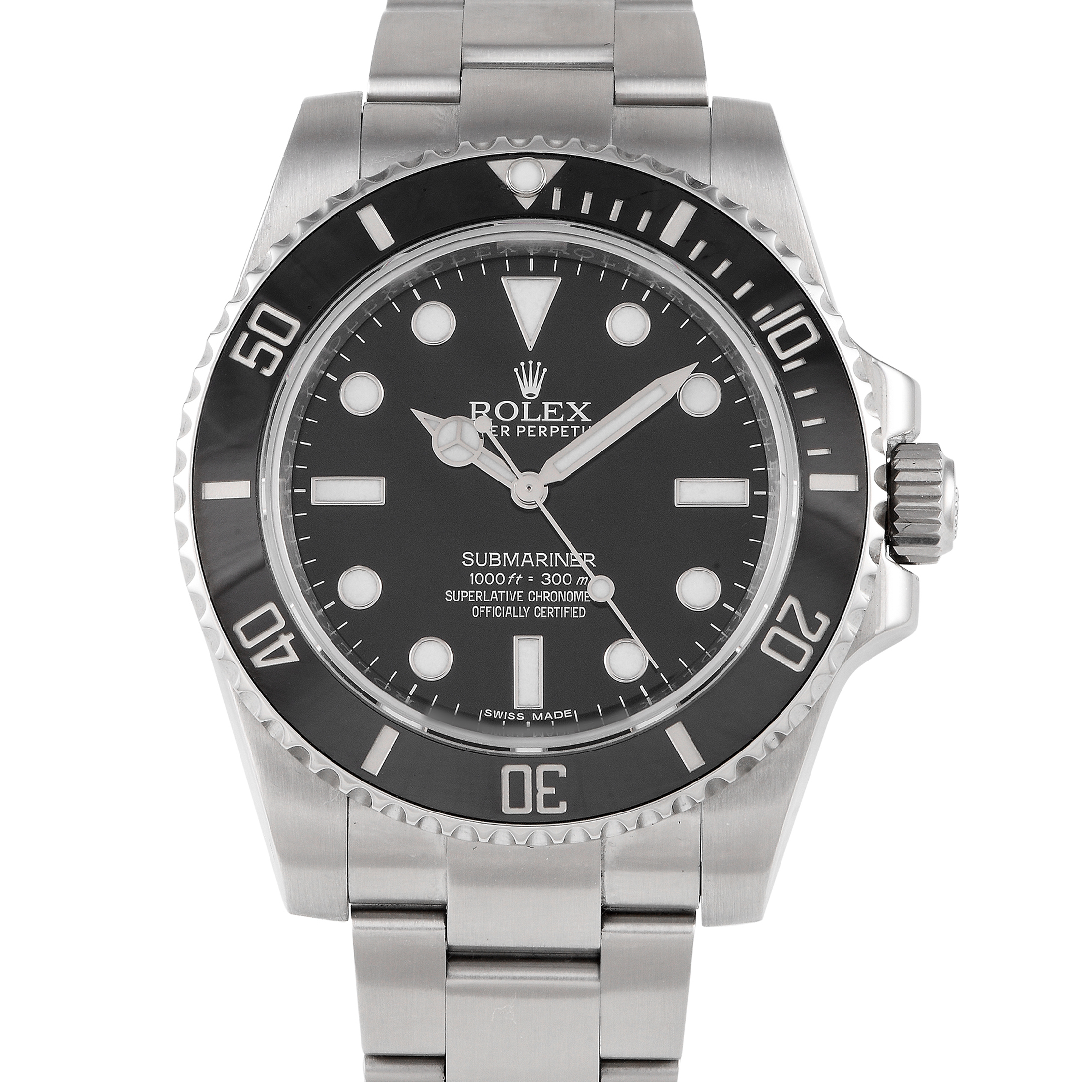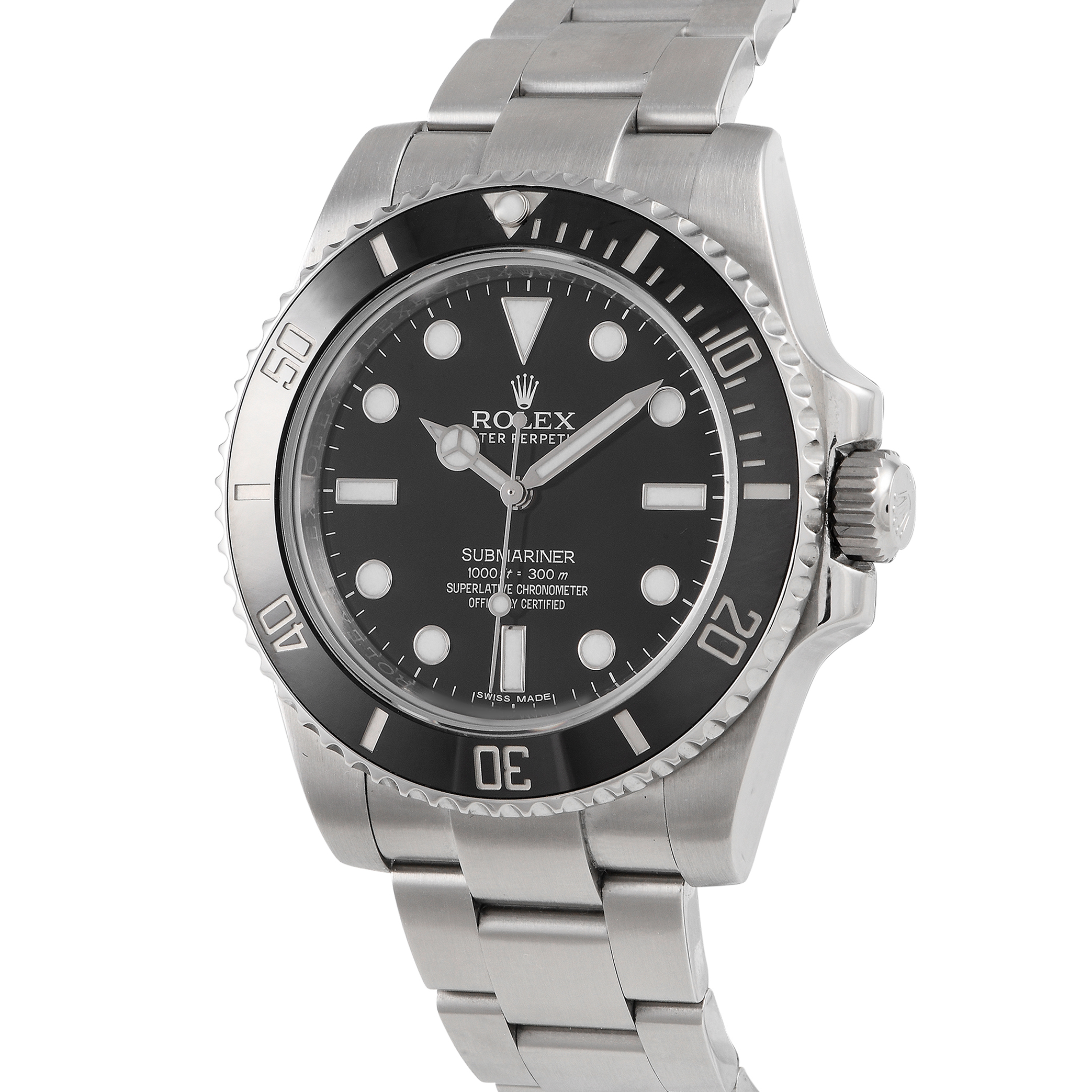 An easy-on-the-eye and dependable companion for your water adventures. This Rolex Submariner No Date ref.114060 features the luxury brand’s water-resistant Oyster case. It has a legible black-and-white dial, with 18K white gold hands and hour indicators filled with blue-glowing luminescence. Around the dial is a diver’s bezel in black Cerachrom engraved with numerals. Inside the 40mm-wide 904L steel case is the COSC Chronometer certified caliber 3130 automatic movement. A steel bracelet ensures a secure and comfortable fit on the wrist.