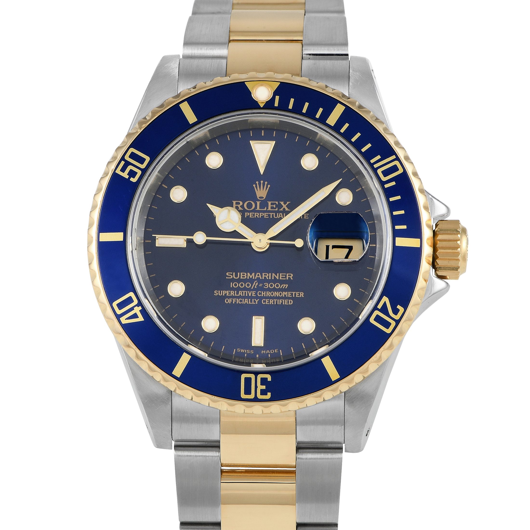 This pre-owned Rolex Submariner Bluesy Two-Tone Watch 16613 comes with a gift box.
