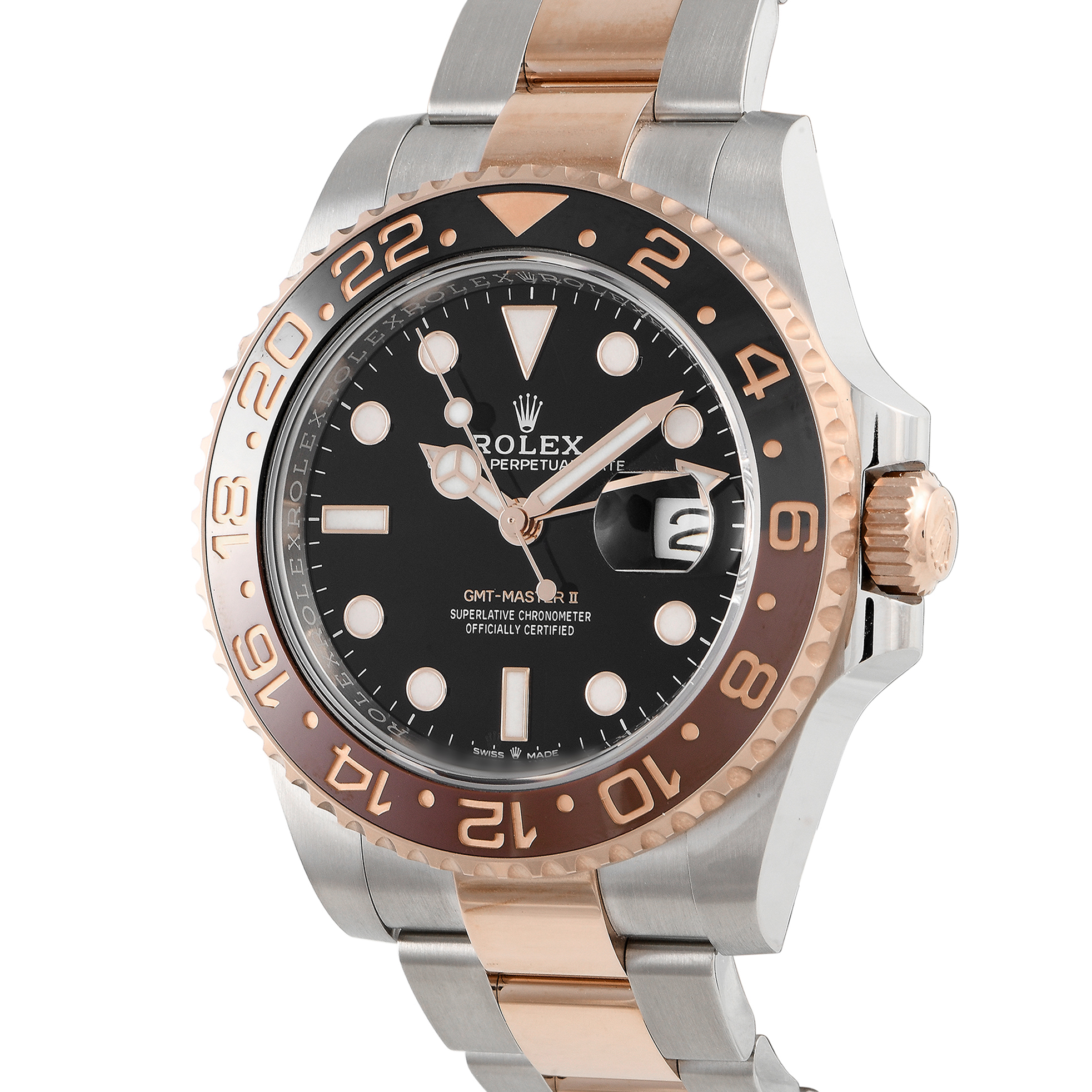 Papers and the manufacturer’s box accompany this unworn Rolex GMT-Master II “Rootbeer” Steel and 18K Everose Gold Men’s Watch 126711CHNR.