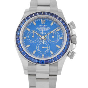 Crafted in 18K white gold, this Daytona’s true distinction lies in the bespoke customization. This particular timepiece was born from a rare and highly sought-after collaboration between Rolex and luxury retailer Asprey. The bezel is set with blue sapphires, matching the unique blue dial with the “Asprey” signature. Luminous hands and hour markers ensure legibility, while the automatic Caliber 4130 that powers the watch guarantees superlative chronometric precision. The self-winding movement provides a substantial 3-day power reserve.