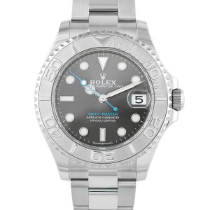 Papers and the manufacturer’s box accompany this pre-owned Rolex Yacht-Master 37 Rolesium Watch 268622.