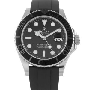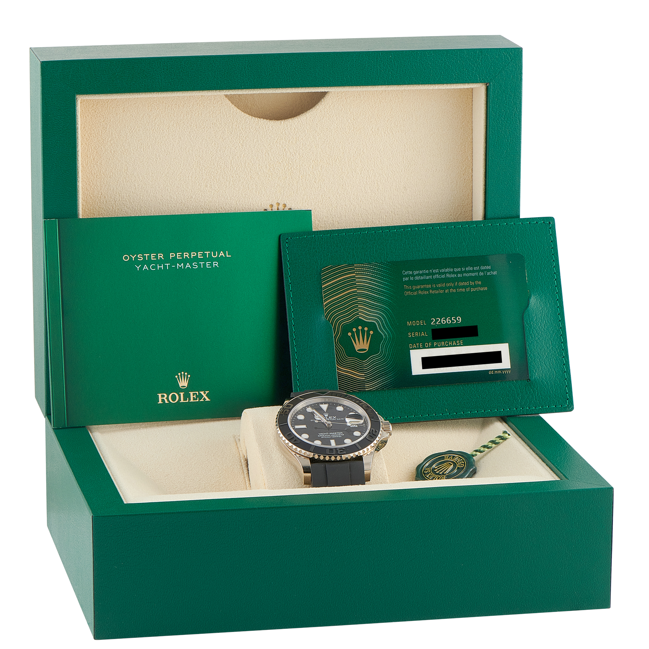 This pre-owned Rolex Yacht-Master 42 Black Dial 18K White Gold Watch 226659 is accompanied by papers and the manufacturer’s box.