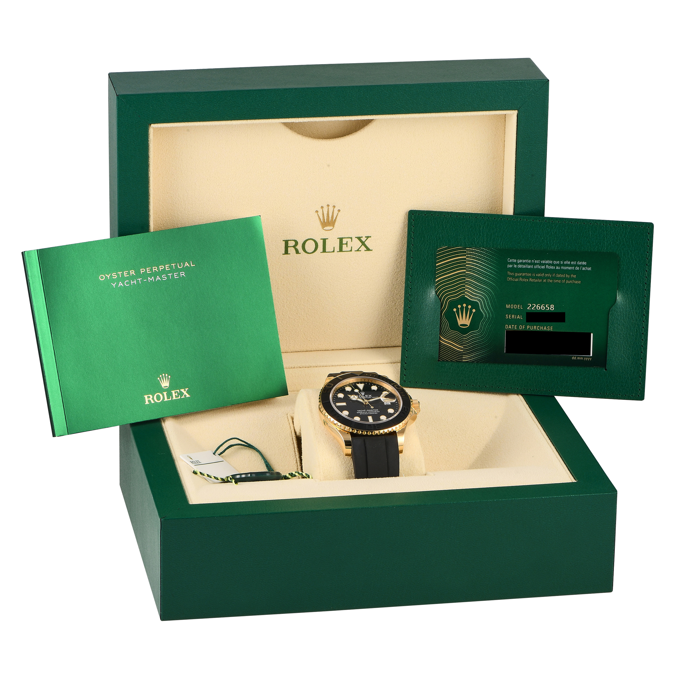 This pre-owned Rolex Yacht-Master 42 Oysterflex 18K Yellow Gold Watch 226658 comes with papers and the manufacturer’s box.