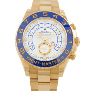 Papers and the manufacturer’s box accompany this pre-owned Rolex Yacht-Master II 18K Yellow Gold Watch 116688.