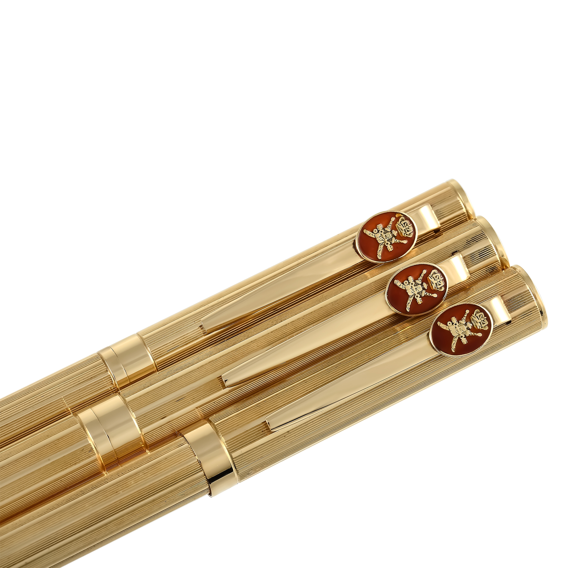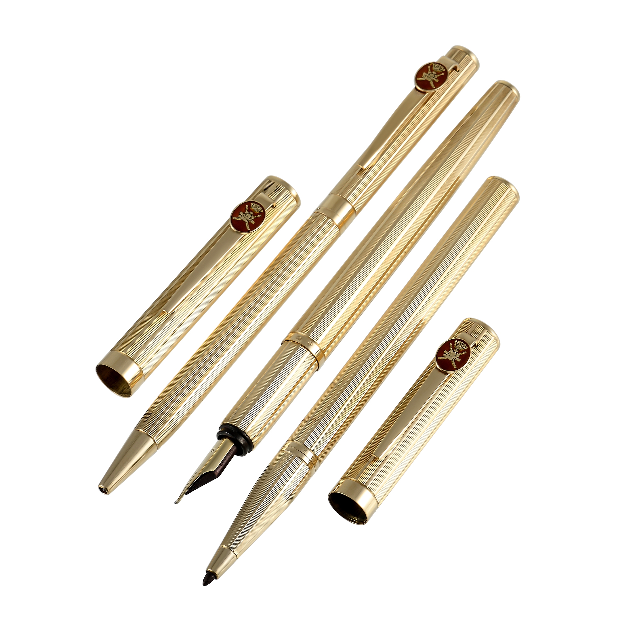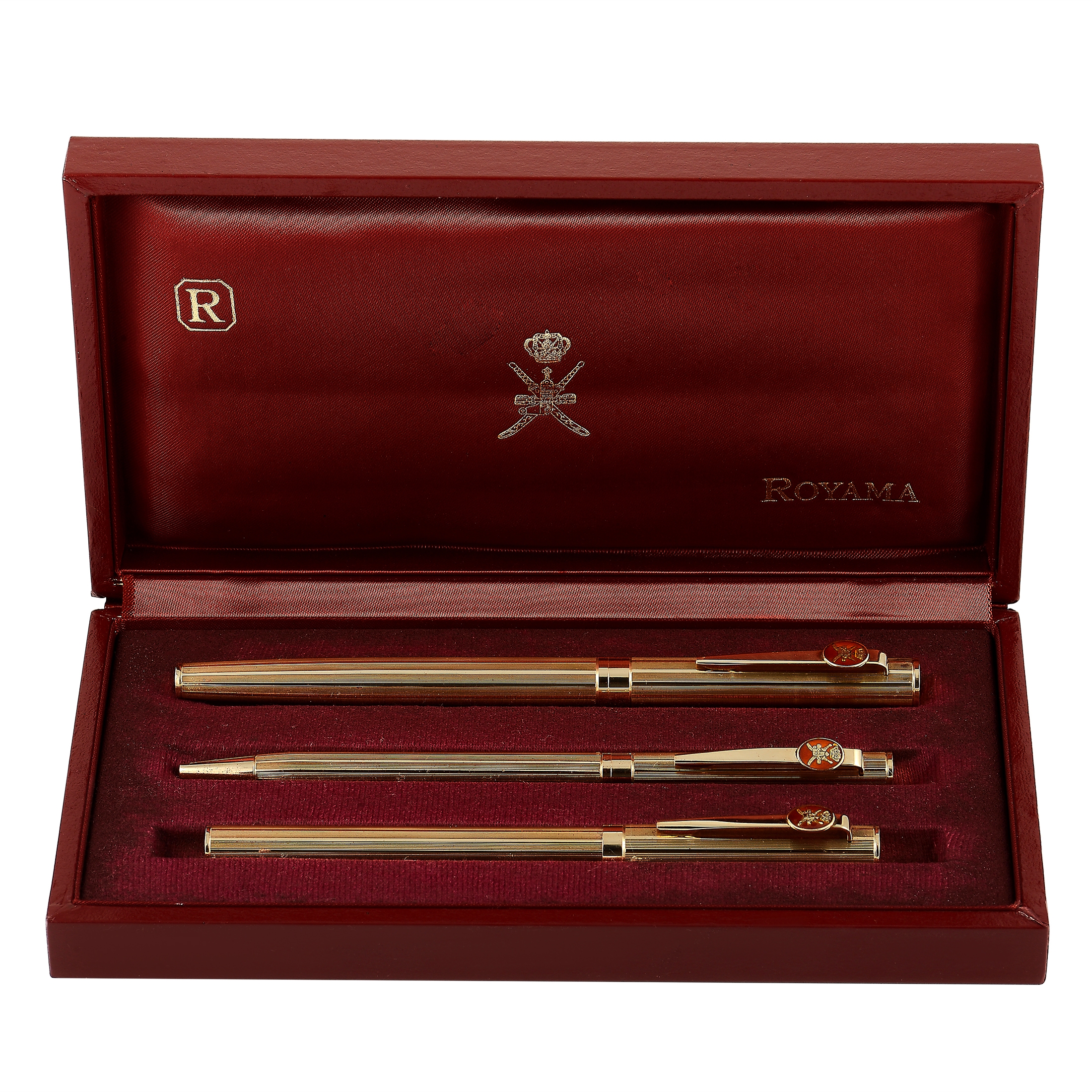 This gorgeous set of three 18K textured yellow gold pens were made by Royama and gifted by the Sultan of Oman. Each pen features the Khanjar, the national emblem of Oman, against a red enamel background. One pen features a fountain tip, one is a retractable ball point, and the other has a felt tip, allowing you to meet almost all of your writing needs with a single set. The manufacturer’s box is a deep red color with golden accents, including the Khanjar on top of the case. The inside of the box is lined with a light silky fabric that displays the Khanjar with crown, and the Royama signature.