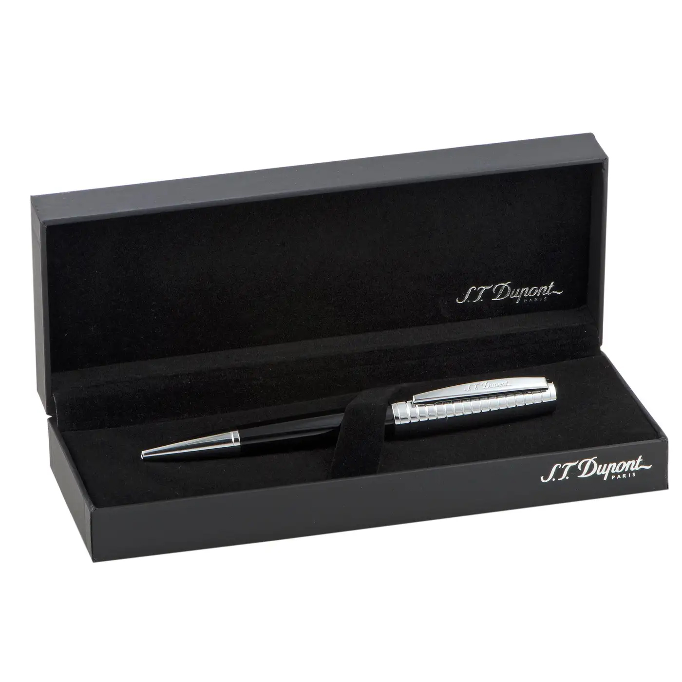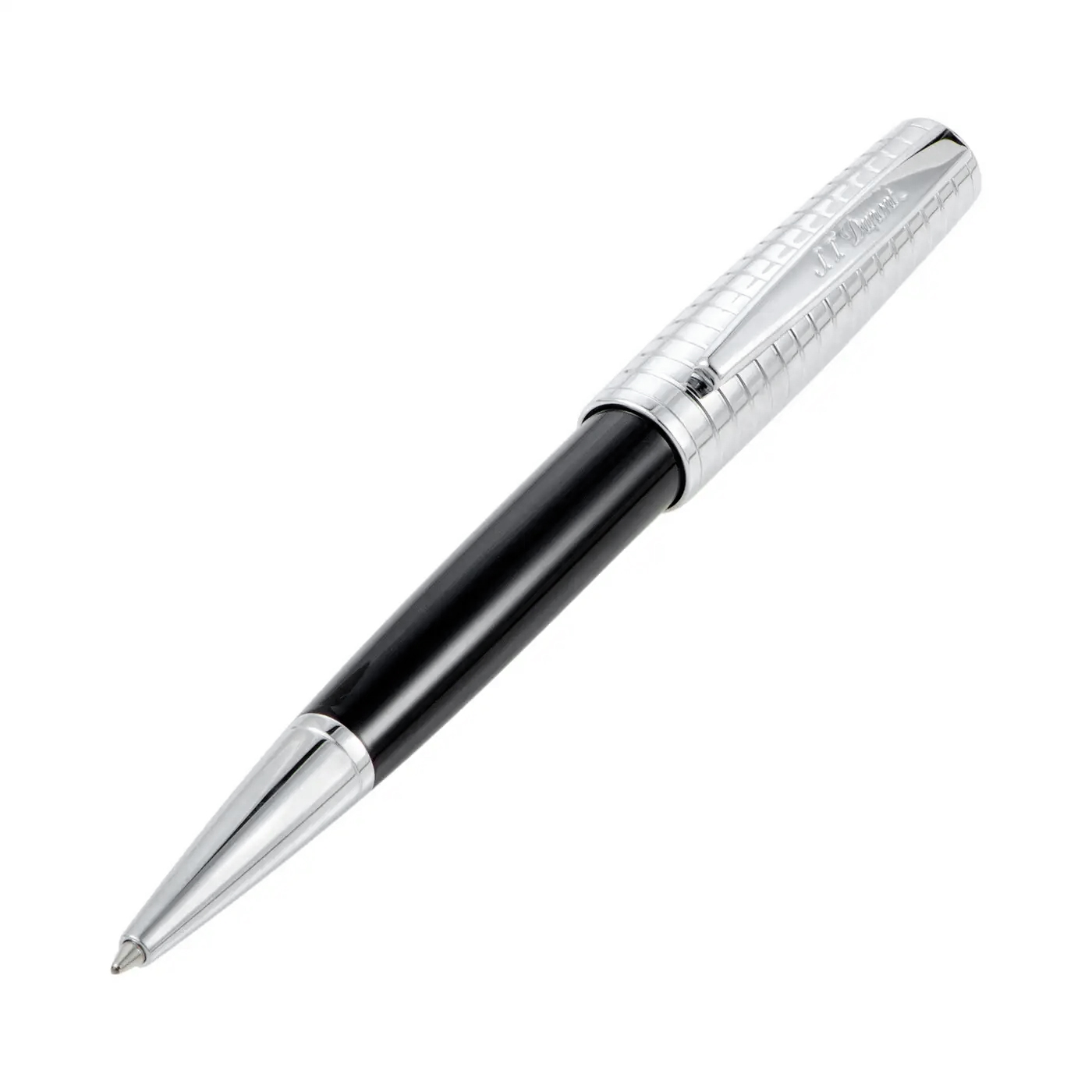 Featuring a compellingly elegant combination of striking black and enticing chrome, this exquisite pen presents an exceptional choice if you are looking for an accessory that is both incredibly stylish and splendidly understated. The pen is designed by S.T. Dupont and is engraved with the brand’s logo.