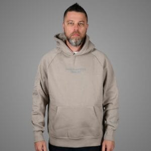 The Unauthorized Dealer® Sand colored Hoodie features an UNAUTHORIZED DEALER® reflective graphic on the front, an embossed GREY MARKET® logo on the right sleeve, a reflective LB icon on the left sleeve cuff, and the WAITLIST reflective graphic on the back. This hoodie features an attached hood and a Kangaroo front pocket.