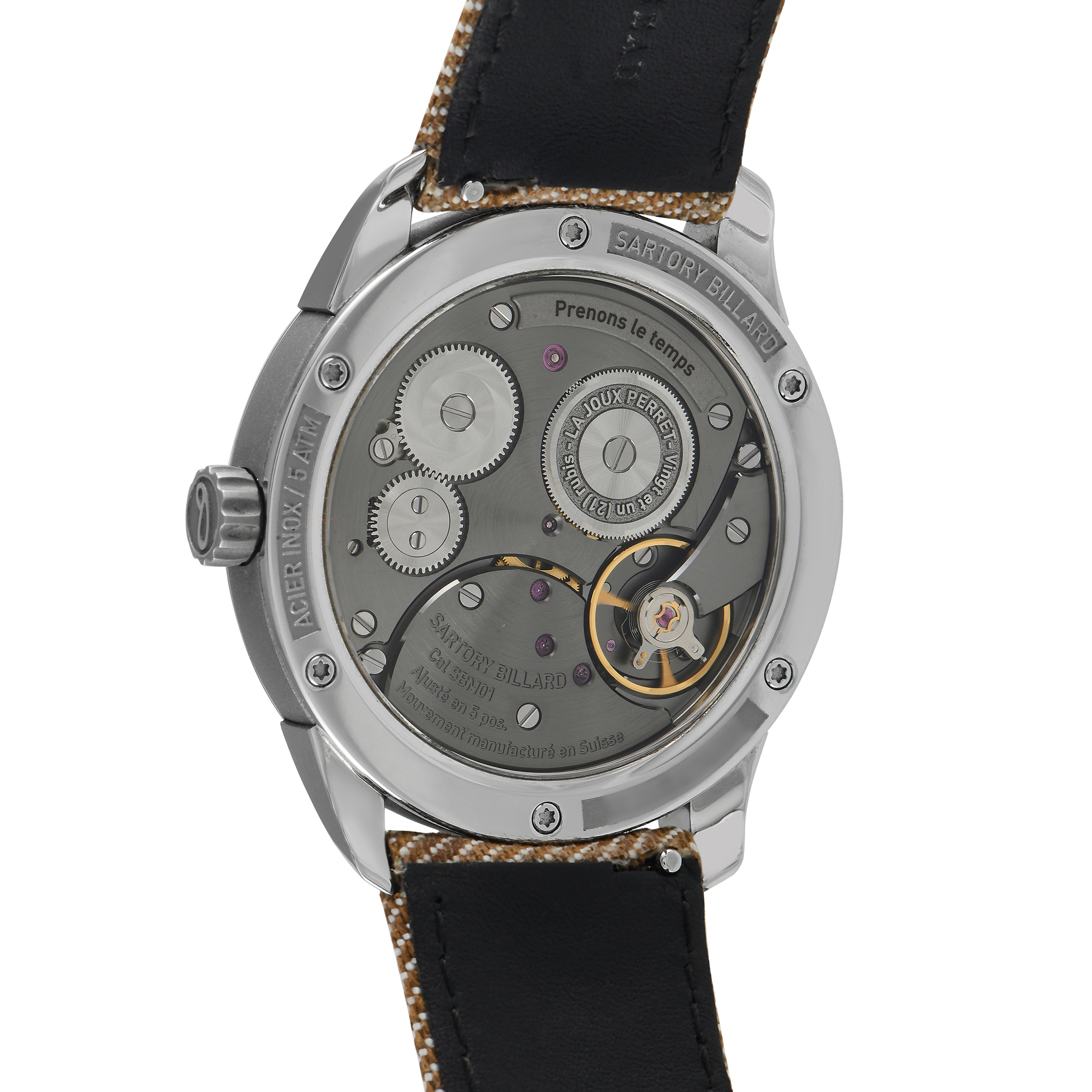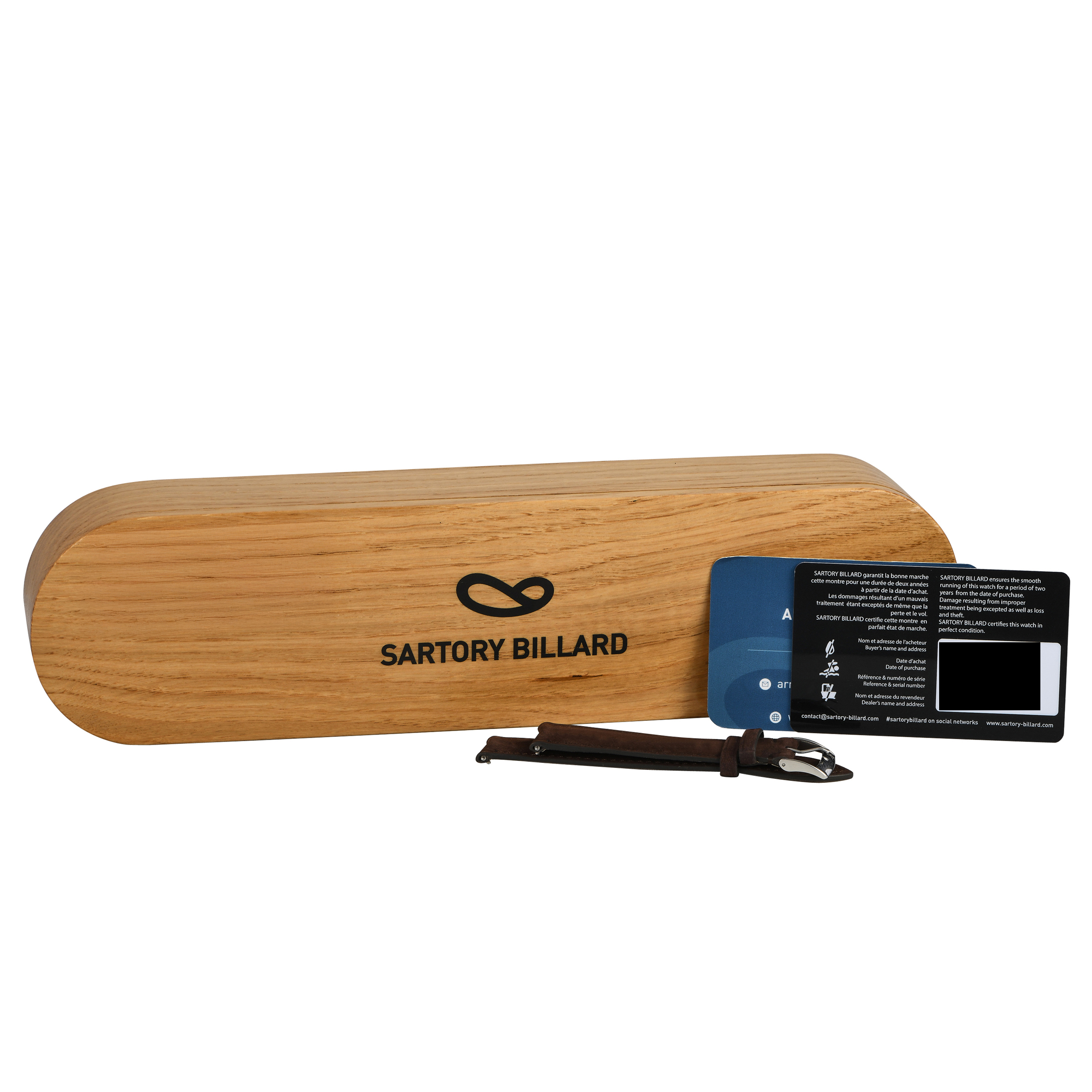 This pre-owned Sartory Billard SB05 Steel Watch comes with the manufacturer’s wooden presentation box, extra leather straps, and papers.