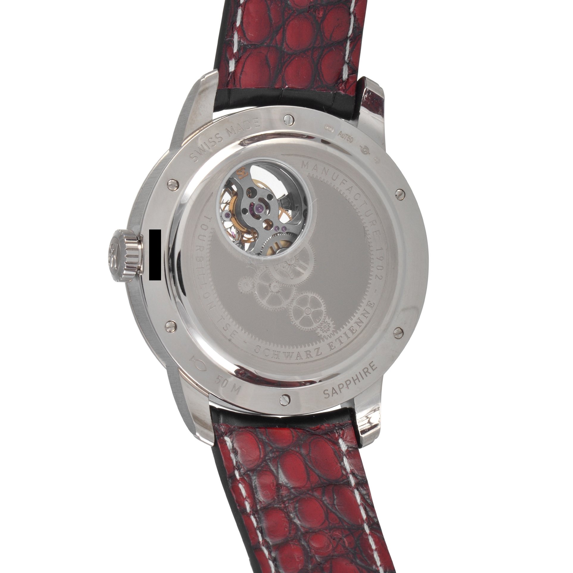 The Schwarz-Etienne La Chaux-de-Fonds Tourbillon Watch, reference number WCF09TSE06WG04AA, provides you with a peek into the watch’s intricate inner-workings.