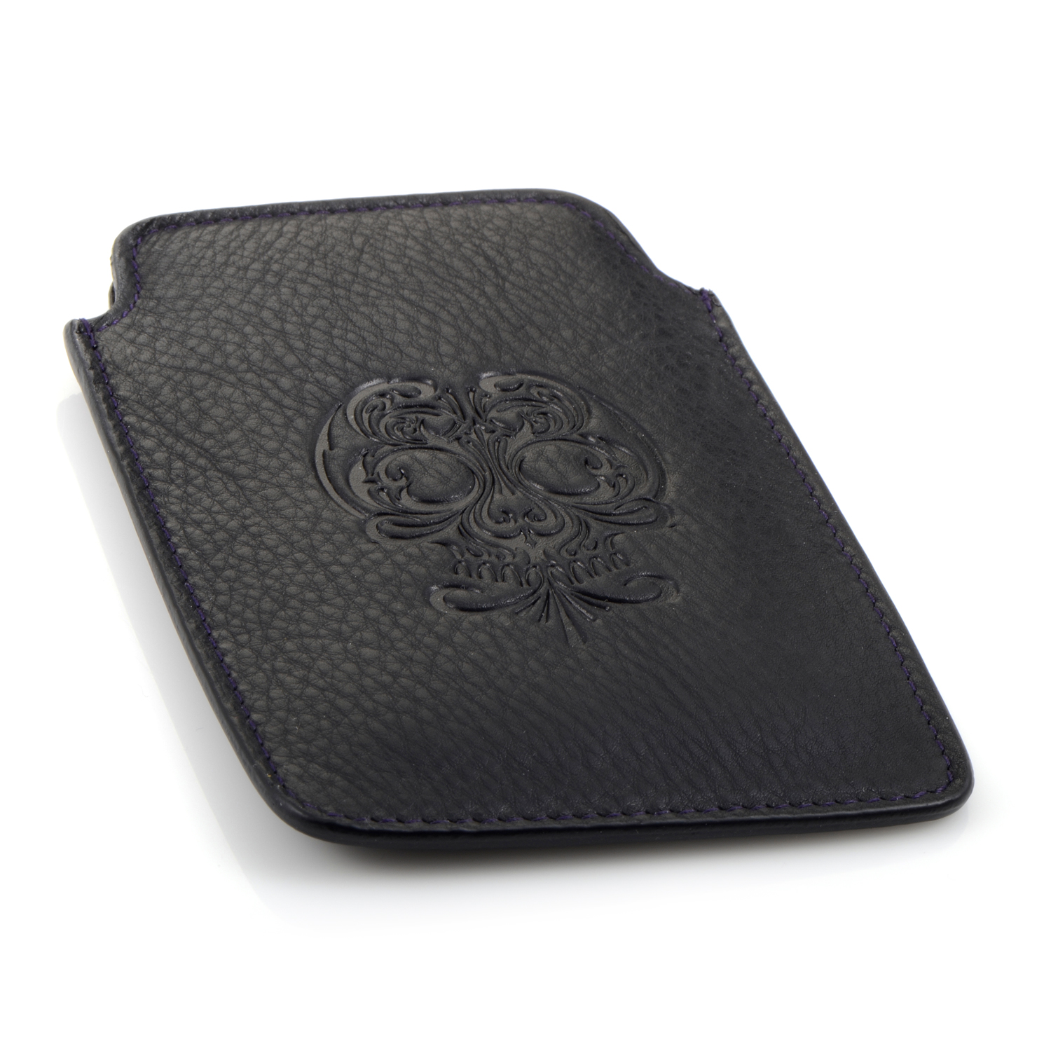 Understated yet undeniably Rock ‘n Roll, this decorative skull engraved black leather iPhone case is a stunning phone protector and style accessory that is proudly engraved with the Stephen Webster name.