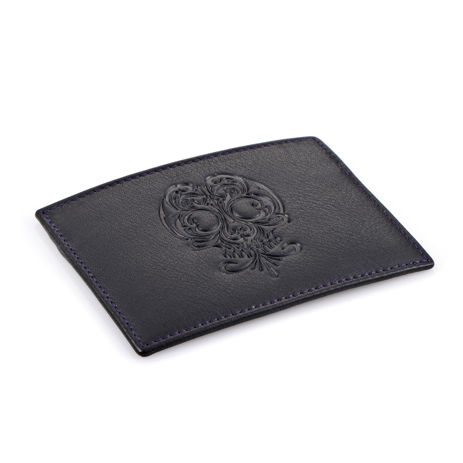 Practical and elegant, this stunning card holder from Stephen Webster is a tasteful item of immense quality, made of black calf leather and adorned with violet stitching while boasting marvelous imprint on the back.