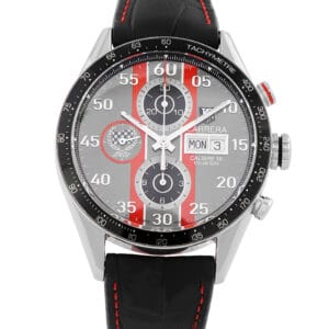 Created to celebrate the prestigious Goodwood Festival of Speed motorsport event in the U.K., this limited edition Carrera pays tribute to speed and precision engineering. It is a rare and compelling watch released in only 250 pieces. It features a 43mm case in polished stainless steel, topped with a black ceramic tachymeter bezel, and paired with a black-and-red leather strap. The dial features distinctive red racing stripes and the Goodwood crest that immediately signifies its exclusive lineage. Driving this powerful design is Caliber 16 automatic movement, offering chronograph functionality alongside practical day and date displays.