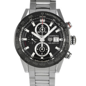 This pre-owned Tag Heuer Carrera Steel and Ceramic Men’s Watch CAR201Z.BA0714 comes with papers and the manufacturer’s box.